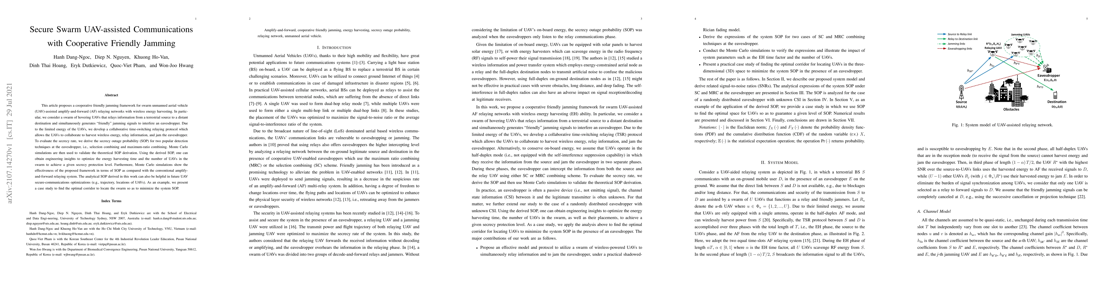 This paper proposes a cooperative jamming framework for swarm UAV-assisted relay networks with wireless energy harvesting, optimizing secrecy rate through derived secrecy outage probability. Monte Carlo simulations validate the effectiveness of the proposed framework in enhancing security compared to conventional systems.