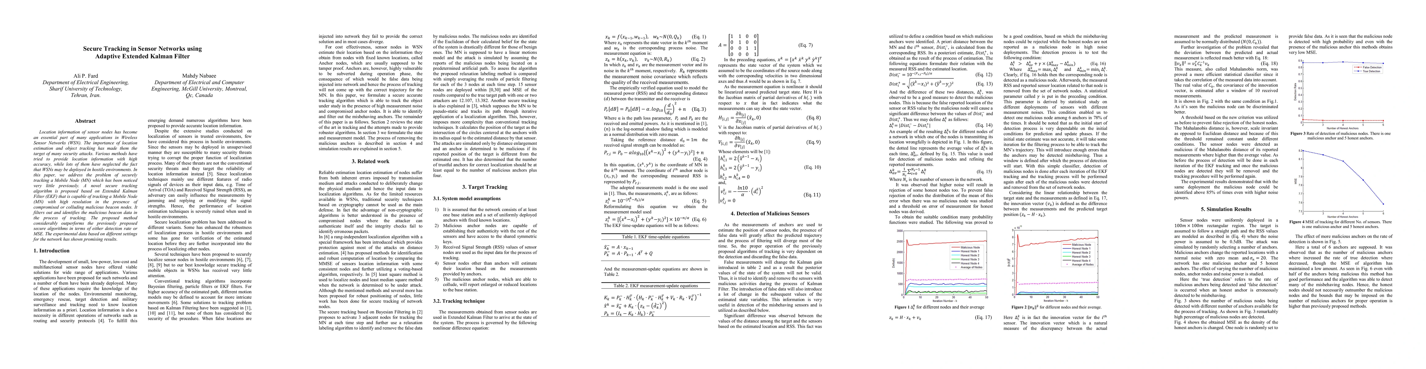 This paper proposes a novel secure tracking algorithm using an Adaptive Extended Kalman Filter (AEKF) to accurately track Mobile Nodes in Wireless Sensor Networks while filtering out malicious beacon data from compromised nodes, outperforming existing secure methods in detection rate and Mean Squared Error. Experimental results show promising performance across various network settings.