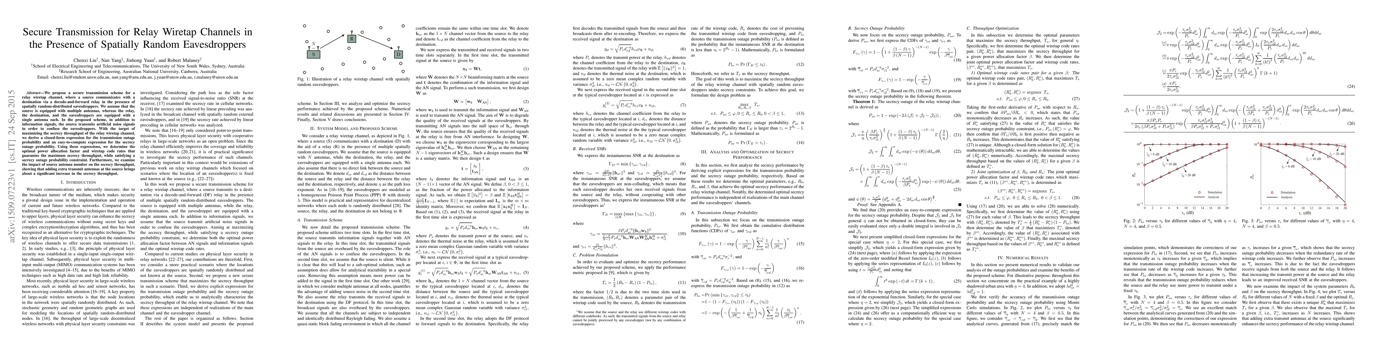 This paper proposes a secure transmission scheme for a relay wiretap channel with spatially random eavesdroppers, utilizing artificial noise to confuse them. It derives optimal power allocation and code rates to maximize secrecy throughput while satisfying outage probability constraints.