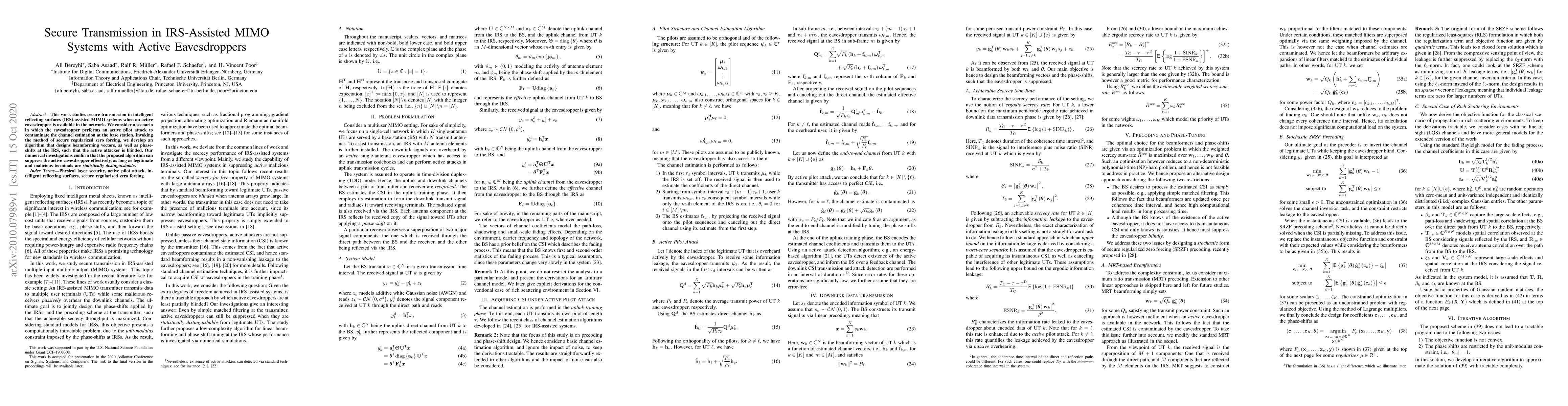 This paper proposes an algorithm to secure IRS-assisted MIMO systems against active eavesdroppers using secure regularized zero forcing, achieving effective suppression when legitimate and malicious terminals are distinguishable. Numerical results demonstrate the algorithm's efficacy in mitigating the impact of active pilot attacks.