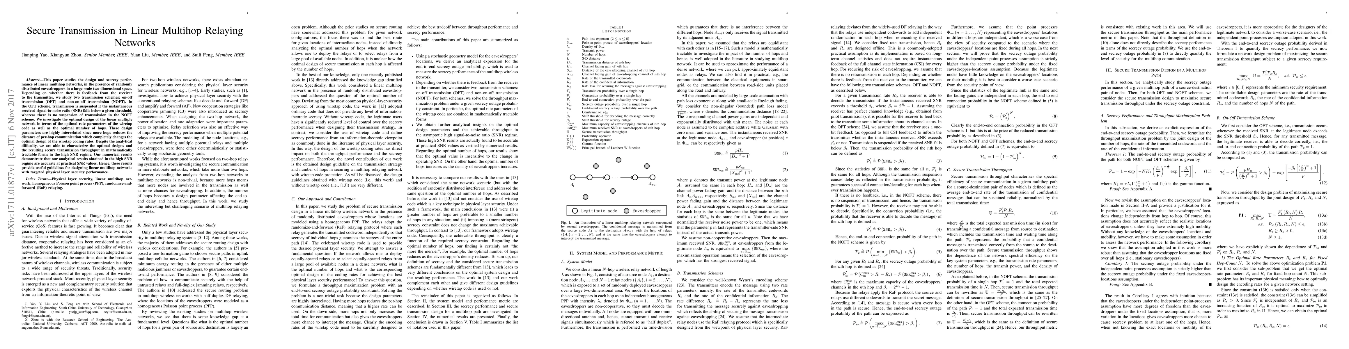 This paper investigates secure transmission in linear multihop networks with randomly distributed eavesdroppers, analyzing two transmission schemes: on-off and non-on-off. It characterizes optimal design parameters and secure throughput, demonstrating analytical accuracy at practical SNRs and providing guidelines for secure network design.