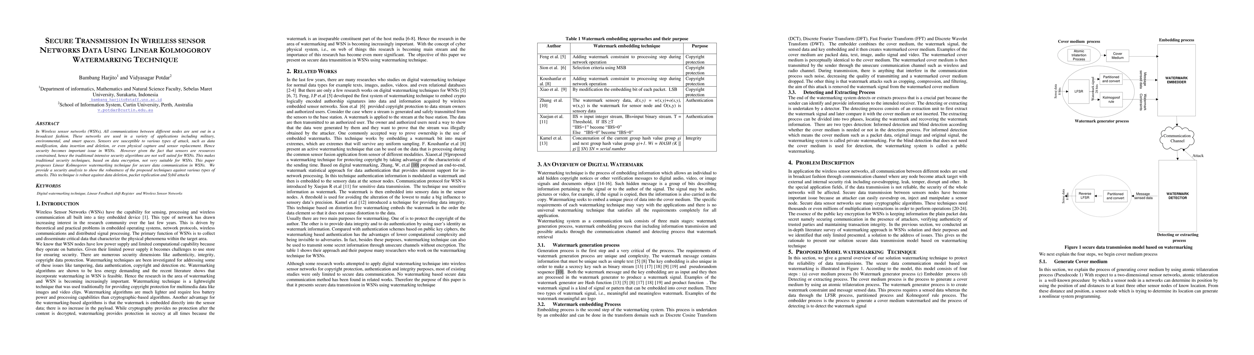 This paper proposes a secure data transmission method for Wireless Sensor Networks using Linear Kolmogorov watermarking, which resists various attacks such as data deletion and Sybil attacks.