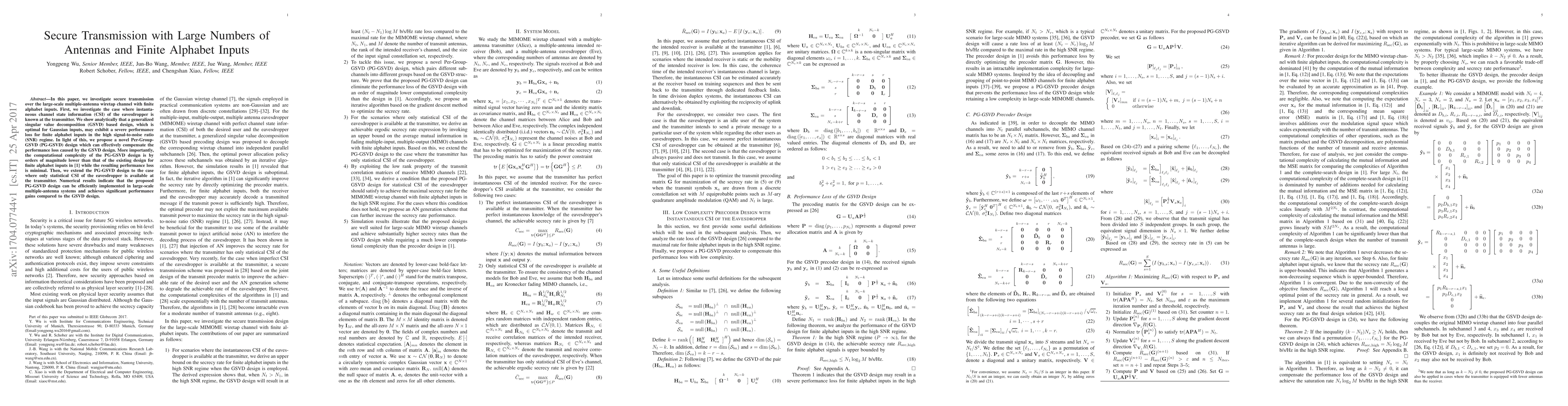 In this paper, we investigate secure transmission over the large-scale multiple-antenna wiretap channel with finite alphabet inputs. First, we investigate the case where instantaneous channel state information (CSI) of the eavesdropper is known at the transmitter. We show analytically that a generalized singular value decomposition (GSVD) based design, which is optimal for Gaussian inputs, may exhibit a severe performance loss for finite alphabet inputs in the high signal-to-noise ratio (SNR) regime. In light of this, we propose a novel Per-Group-GSVD (PG-GSVD) design which can effectively compensate the performance loss caused by the GSVD design. More importantly, the computational complexity of the PG-GSVD design is by orders of magnitude lower than that of the existing design for finite alphabet inputs in [1] while the resulting performance loss is minimal. Then, we extend the PG-GSVD design to the case where only statistical CSI of the eavesdropper is available at the transmitter. Numerical results indicate that the proposed PG-GSVD design can be efficiently implemented in large-scale multiple-antenna systems and achieves significant performance gains compared to the GSVD design.