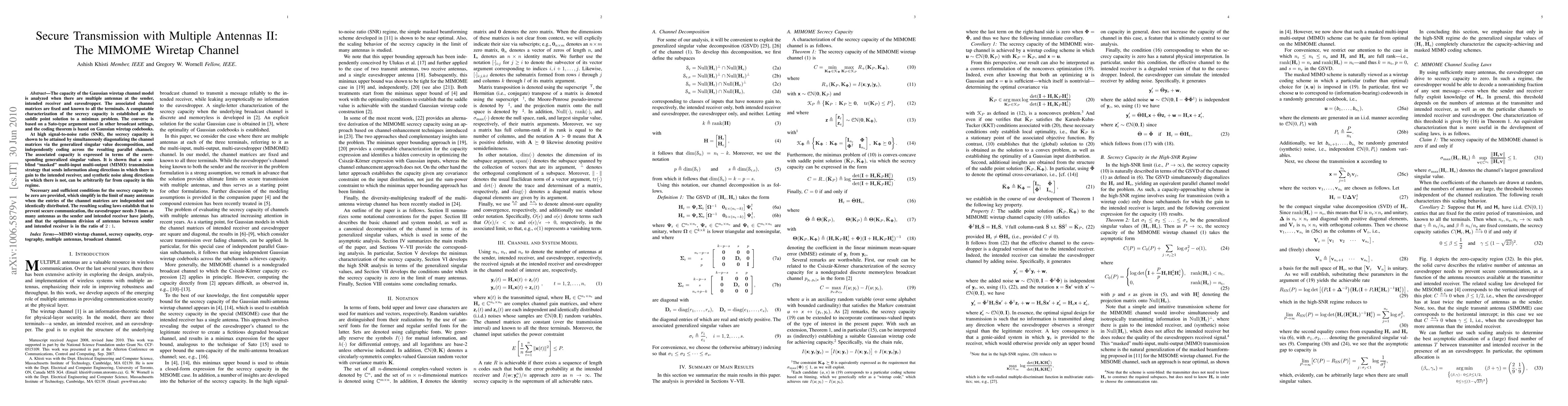 This paper analyzes the capacity of a Gaussian wiretap channel with multiple antennas at the sender, receiver, and eavesdropper. It establishes a computable characterization of the secrecy capacity and shows that high SNR performance is achieved through diagonalizing channel matrices and coding across parallel channels. It also provides conditions for zero secrecy capacity and scaling laws for antenna distribution to prevent secure communication.