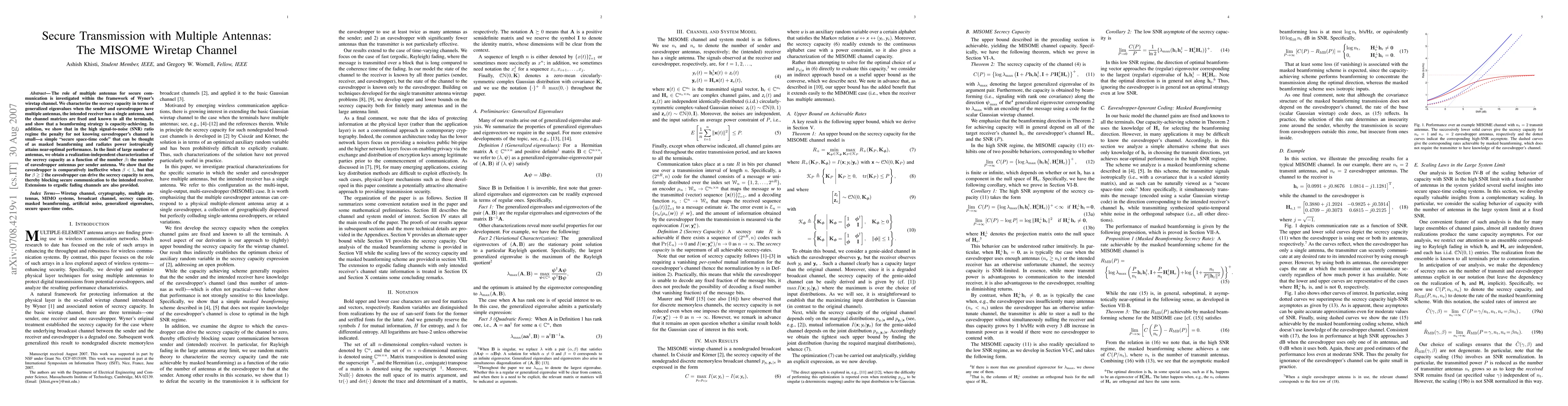 This paper investigates secure communication using multiple antennas in the context of Wyner's wiretap channel, demonstrating that a beamforming strategy achieves secrecy capacity. It shows that a simple "secure space-time code" can maintain near-optimal performance even without knowledge of the eavesdropper's channel, especially at high SNRs.