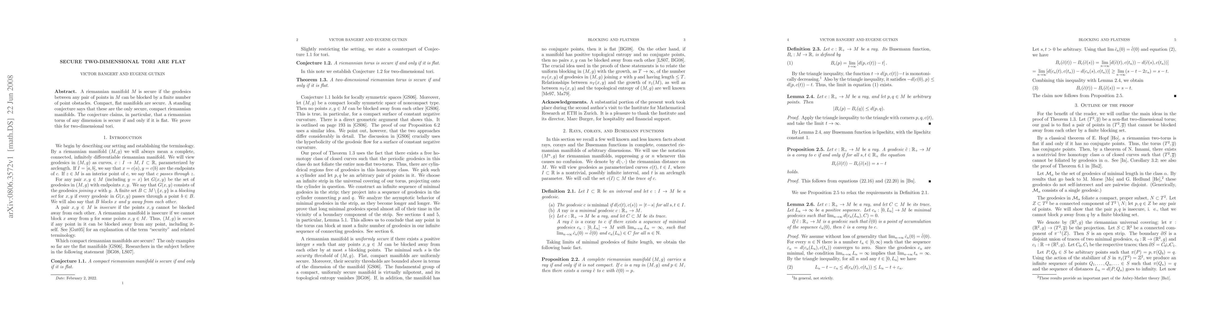 The paper proves that two-dimensional secure Riemannian tori are flat, confirming the conjecture that a secure, compact Riemannian torus is flat, and specifically addressing the two-dimensional case.