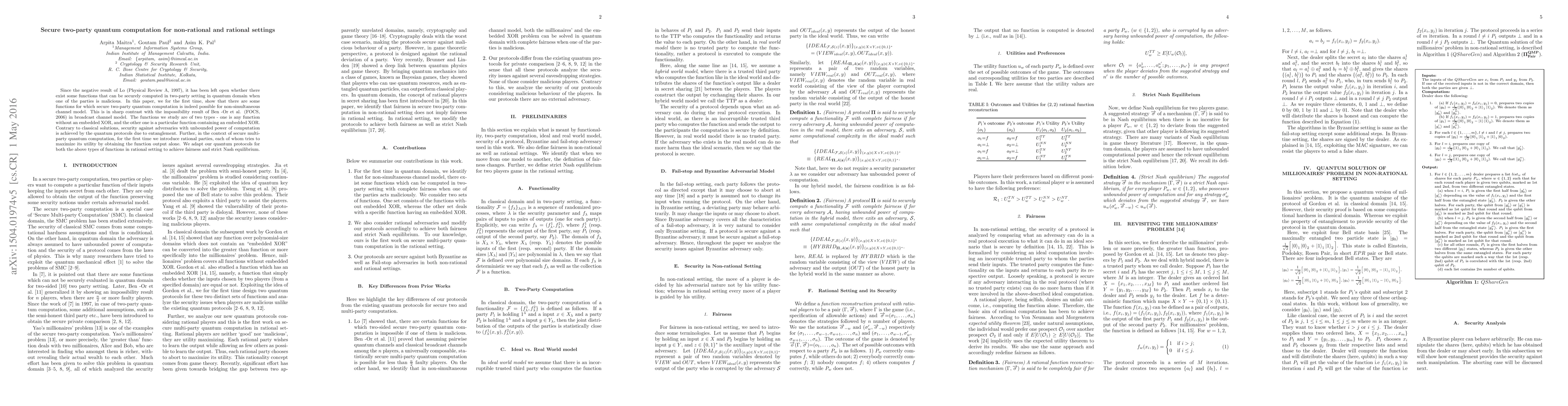 This paper demonstrates the feasibility of secure two-party quantum computation for certain functions under a non-simultaneous channel model, contrasting with classical impossibility results. It introduces rational parties in secure multi-party quantum computation to achieve fairness and strict Nash equilibrium.