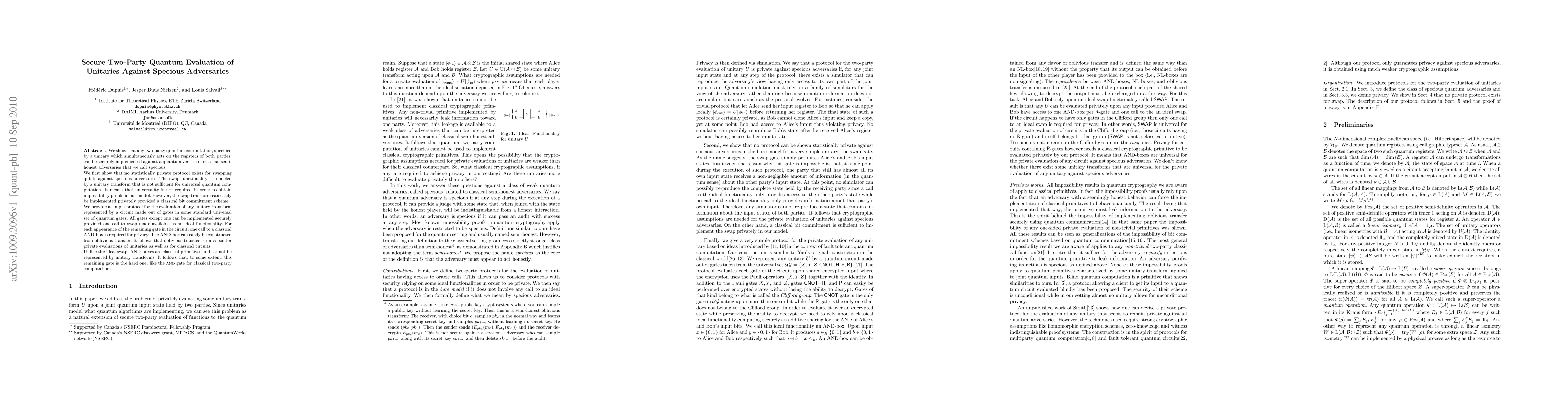 This research presents a method for securely implementing any two-party quantum computation, involving unitaries acting on both parties' registers, against 'specious' adversaries, a quantum version of semi-honest adversaries. The method requires two key private functionalities: a quantum SWAP and a classical private AND-box. The complexity varies based on the unitary's group membership, with Clifford group unitaries needing only SWAP, while others require an AND-box per R-gate. The paper also establishes that SWAP can't be privately implemented without these additional tools.
