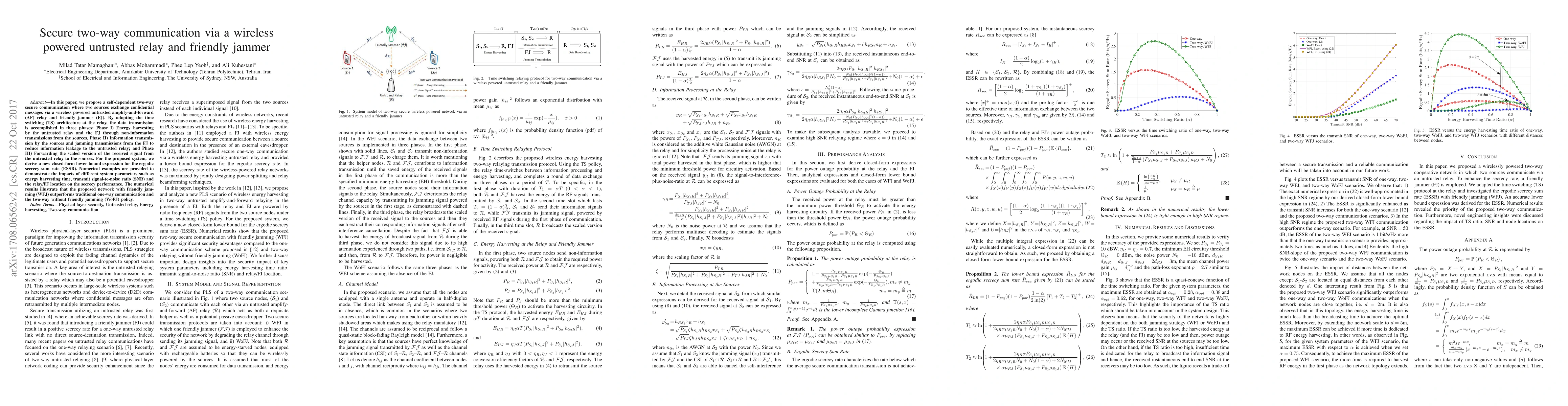 This paper proposes a secure two-way communication system using a wireless powered untrusted relay and friendly jammer, employing a time-switching architecture to harvest energy and transmit information. The system achieves better secrecy performance compared to traditional methods, as demonstrated by a new lower bound expression for the ergodic secrecy sum rate.