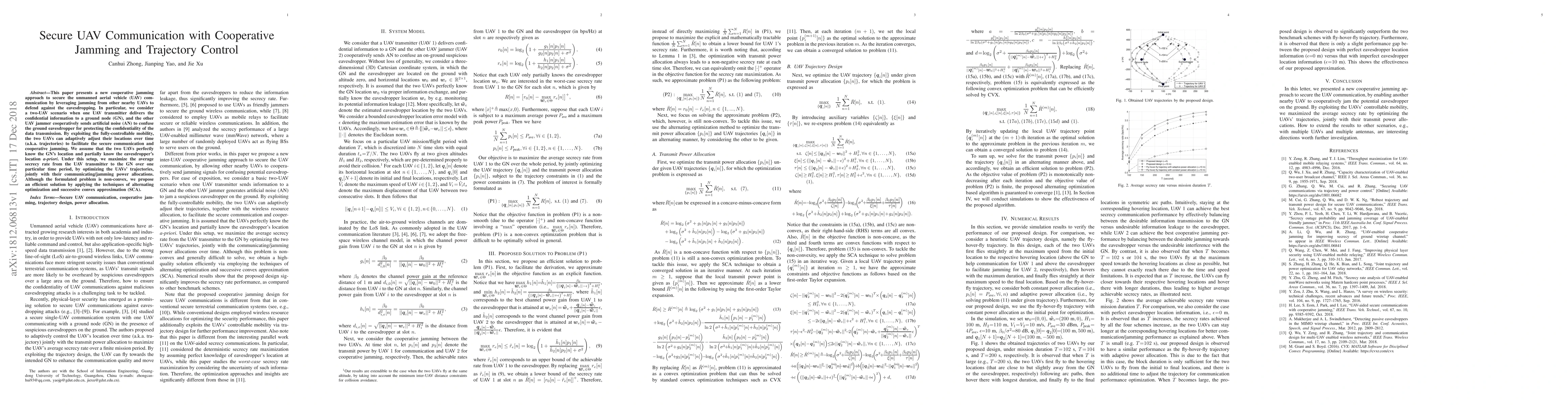 This paper proposes a cooperative jamming method using two UAVs to secure communication by sending artificial noise to confuse eavesdroppers, optimizing their trajectories and power allocations to maximize secrecy rate. An efficient solution is developed using alternating optimization and successive convex approximation.