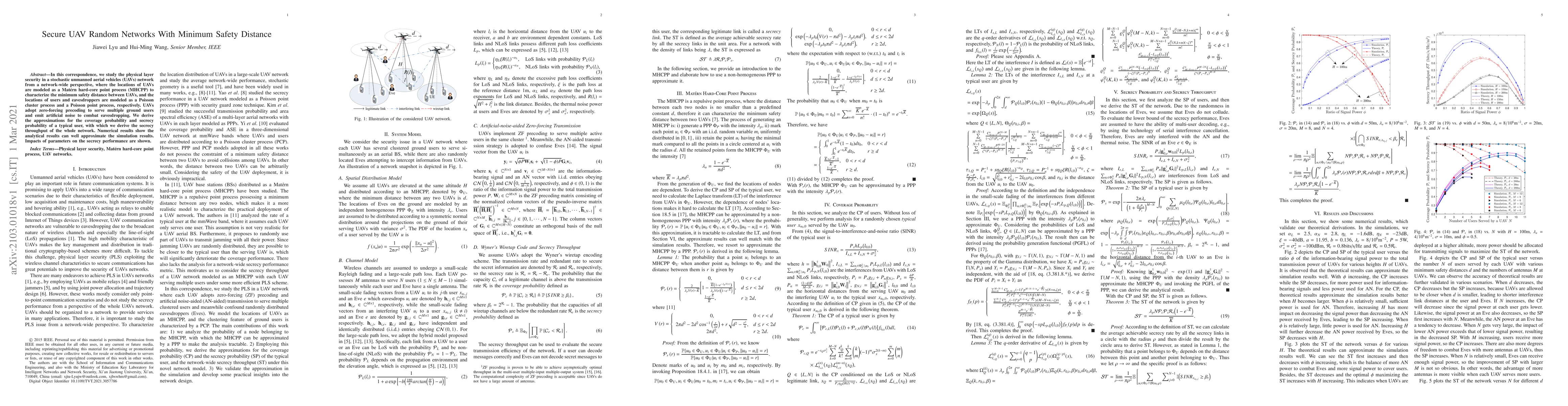 This paper investigates the physical layer security of a UAV network using zero-forcing precoding and artificial noise to combat eavesdropping, achieving good approximations with numerical results that match simulation outcomes.