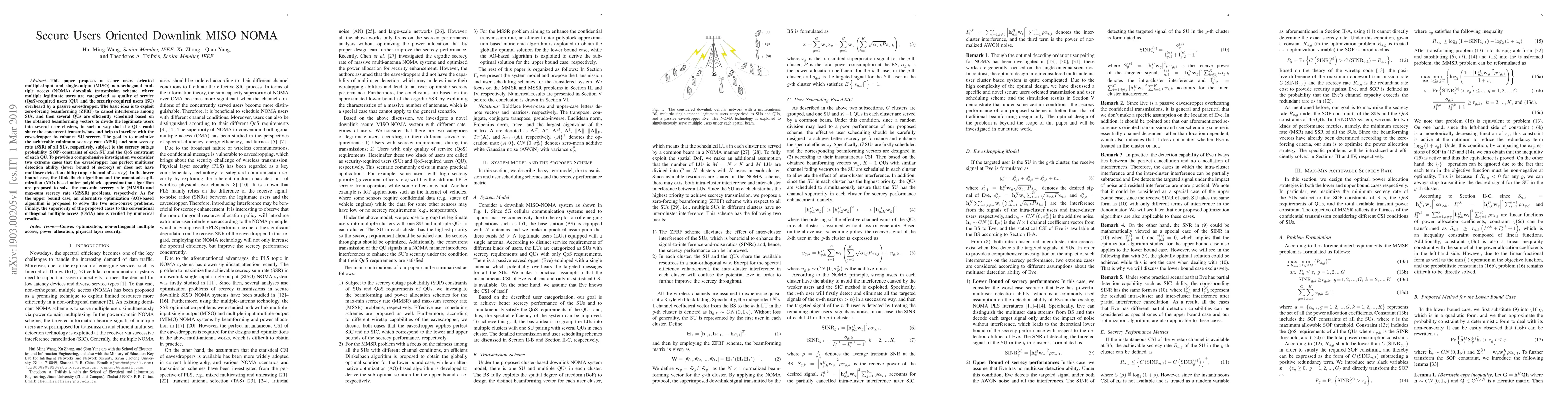 This paper proposes a secure users oriented multiple-input and single-output (MISO) non-orthogonal multiple access (NOMA) downlink transmission scheme, where multiple legitimate users are categorized as quality of service (QoS)-required users (QU) and the security-required users (SU) overheard by a passive eavesdropper. The basic idea is to exploit zero-forcing beamforming (ZFBF) to cancel interference among SUs, and then several QUs are efficiently scheduled based on the obtained beamforming vectors to divide the legitimate users into several user clusters, in such a way that the QUs could share the concurrent transmissions and help to interfere with the eavesdropper to enhance SU secrecy. The goal is to maximize the achievable minimum secrecy rate (MSR) and sum secrecy rate (SSR) of all SUs, respectively, subject to the secrecy outage probability (SOP) constraint of each SU and the QoS constraint of each QU. To provide a comprehensive investigation we consider two extreme cases that the eavesdropper has perfect multiuser detection ability (lower bound of secrecy) or does not have multiuser detection ability (upper bound of secrecy). In the lower bound case, the Dinkelbach algorithm and the monotonic optimization (MO)-based outer polyblock approximation algorithm are proposed to solve the max-min secrecy rate (MMSR) and max-sum secrecy rate (MSSR) problems, respectively. As for the upper bound case, an alternative optimization (AO)-based algorithm is proposed to solve the two non-convex problems. Finally, the superiority of the proposed cases to the conventional orthogonal multiple access (OMA) one is verified by numerical results.