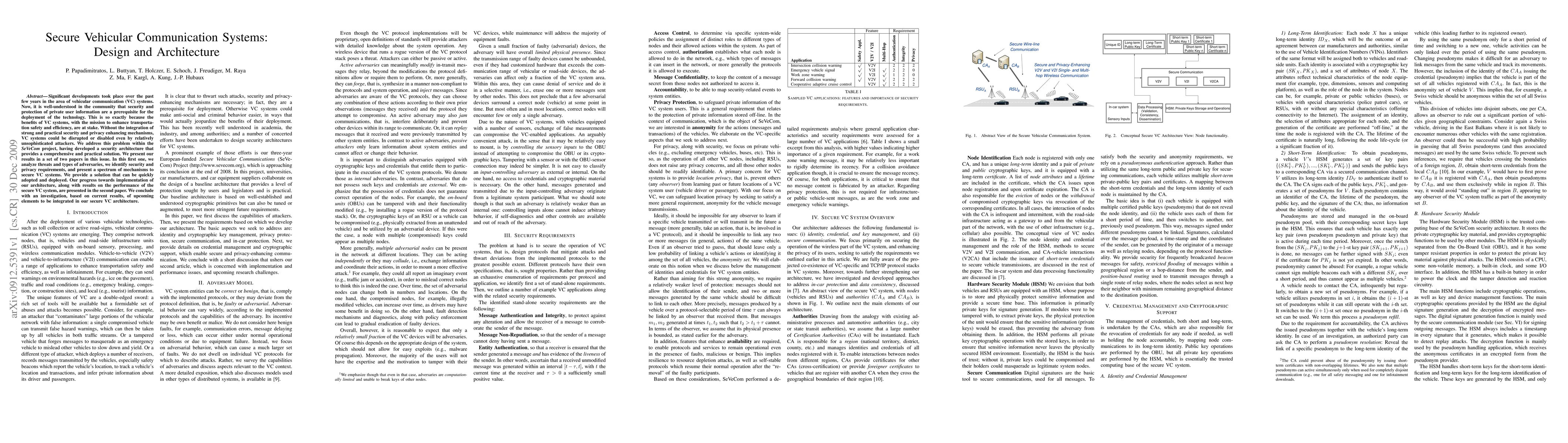 The paper presents a security architecture for vehicular communication systems, including identity and credential management, secure communication protocols, and privacy-enhancing mechanisms.