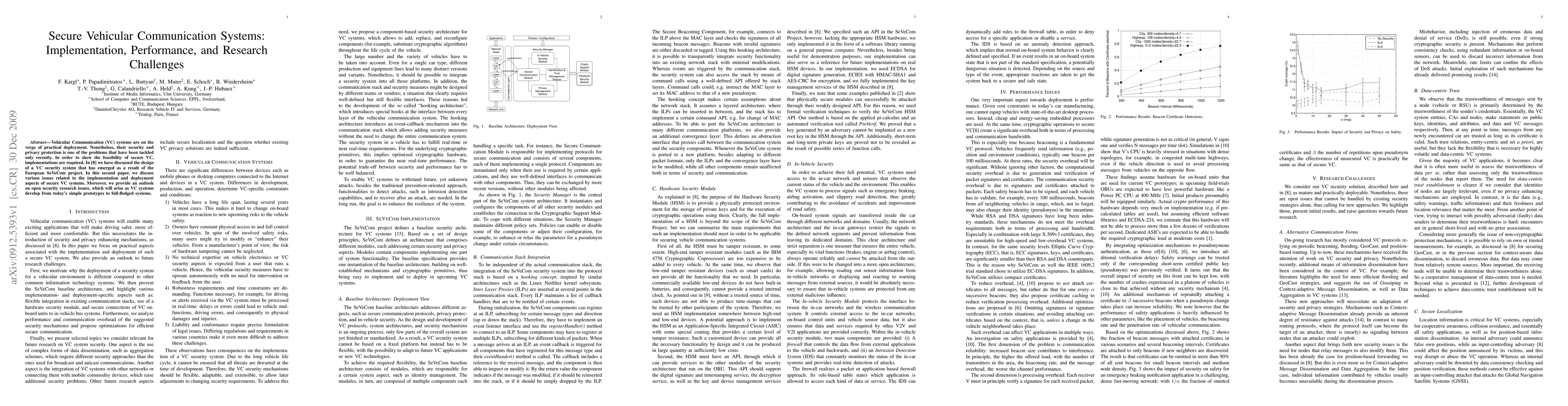 This paper explores the implementation and performance of secure vehicular communication systems, highlighting the design from the SeVeCom project. It also identifies ongoing challenges and future research directions in securing these evolving systems.