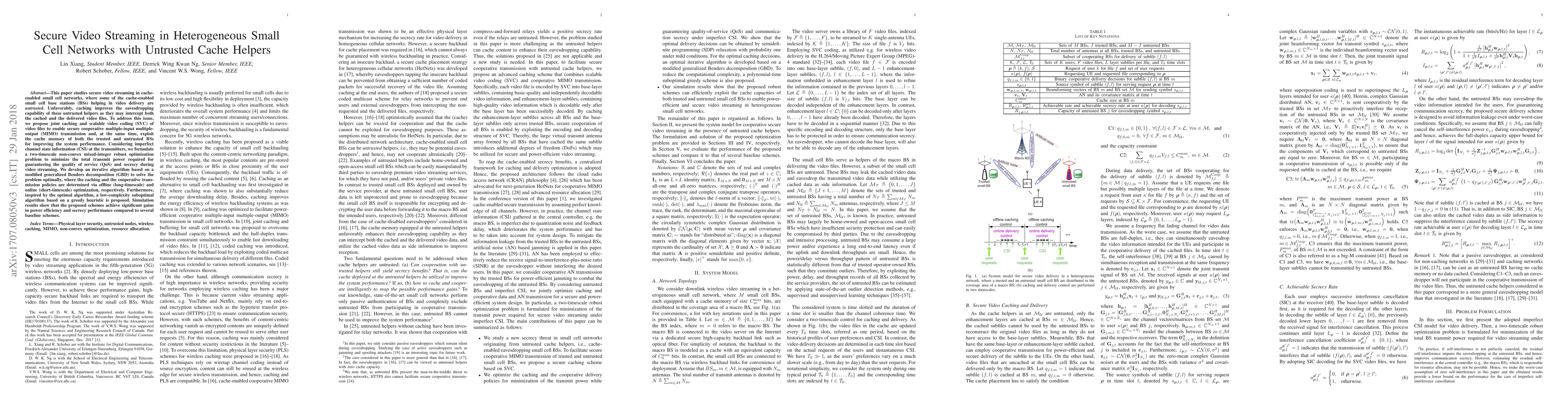 This paper proposes secure video streaming methods in heterogeneous small cell networks with untrusted cache helpers, addressing the risk of eavesdropping by leveraging joint caching and scalable video coding with secure cooperative MIMO transmission. An optimization algorithm is developed to minimize transmit power while ensuring QoS and secrecy, with a low-complexity heuristic for practical deployment.