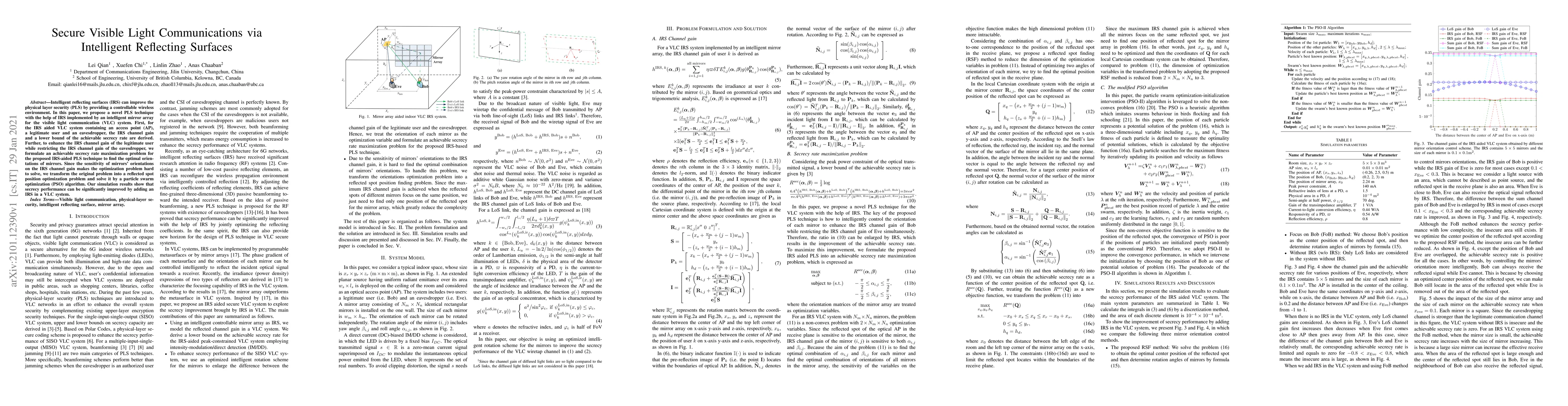 This paper proposes a novel technique using intelligent reflecting surfaces (IRS) to enhance physical layer security in a visible light communication (VLC) system. It formulates an optimization problem to maximize the secrecy rate by adjusting mirror orientations, solved via a particle swarm optimization algorithm, demonstrating significant improvement in secrecy performance.