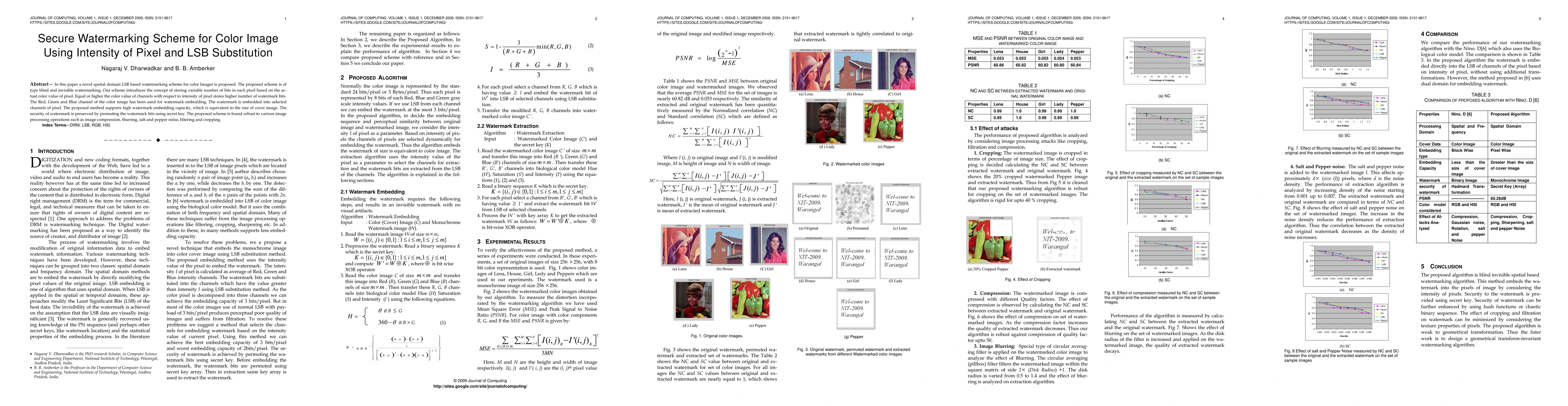 This paper proposes a novel blind and invisible spatial domain LSB watermarking scheme for color images, embedding variable bits based on pixel intensity and color channel values. The method uses a secret key for bit permutation to enhance security, and it remains robust against various image processing operations.