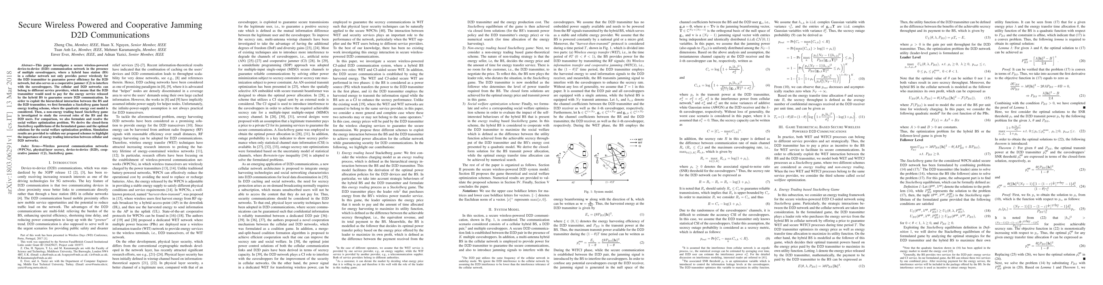This paper explores secure wireless-powered D2D communications with cooperative jamming against eavesdroppers, proposing a hybrid BS that both powers D2D transmitters and interferes with eavesdroppers. It formulates Stackelberg games for energy trading and social welfare optimization, deriving equilibriums and optimal solutions, and validates the schemes through simulations.