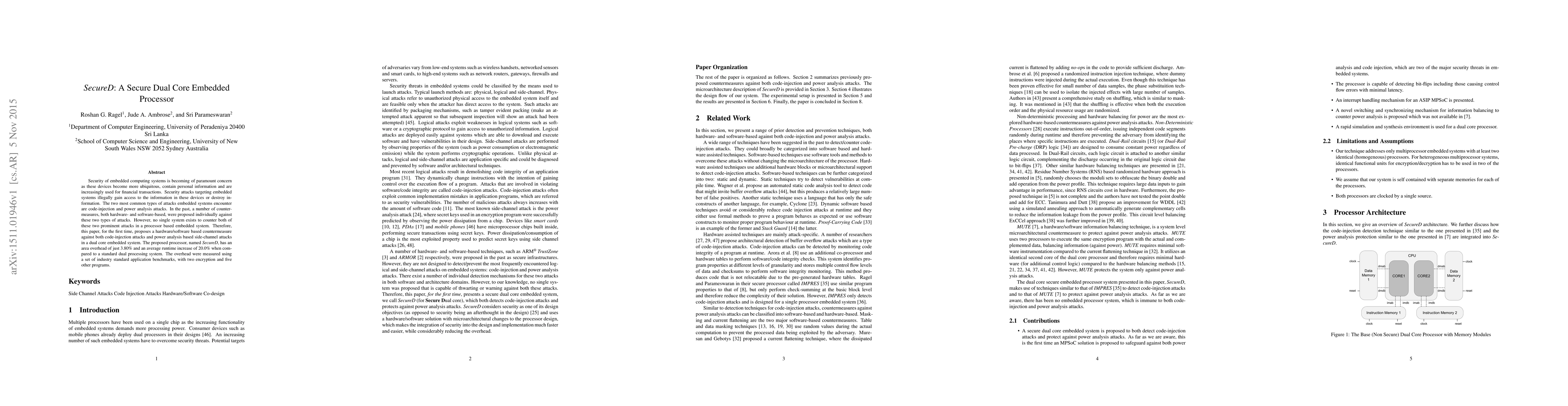 SecureD is a novel dual-core embedded processor designed to counter both code-injection and power analysis attacks through integrated hardware/software countermeasures. It achieves this with minimal overhead of 3.80% in area and a 20% increase in runtime compared to standard dual-core systems.