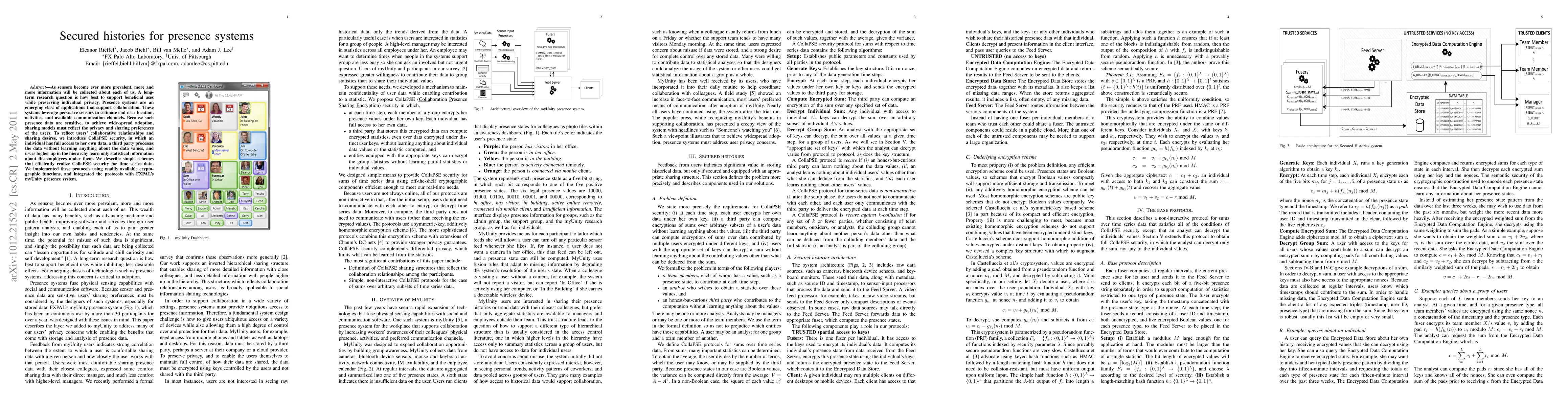 Researchers developed a security model called CollaPSE to enable secure group statistics on encrypted data while preserving individual privacy in presence systems. The model allows users to access their own data, third-party processing without learning data values, and hierarchical users learn only statistical information.