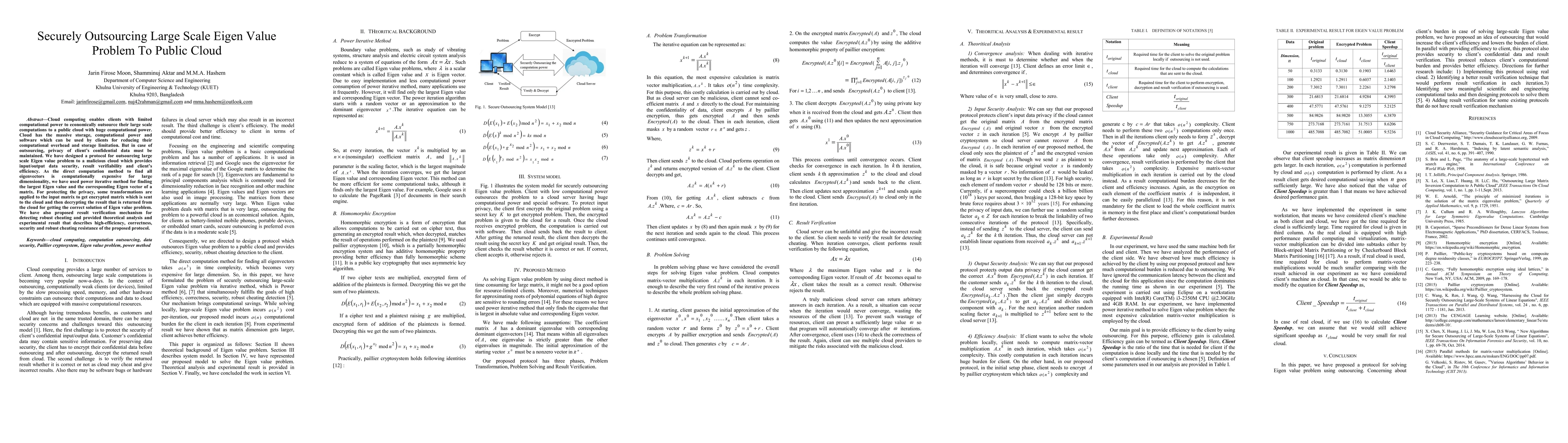 This paper proposes a secure protocol for outsourcing large scale Eigen value problems to a public cloud, ensuring data privacy through encryption and decryption, and employing the power iterative method for efficiency. The protocol also includes a result verification mechanism for robust cheating detection, demonstrating high efficiency, correctness, and security.