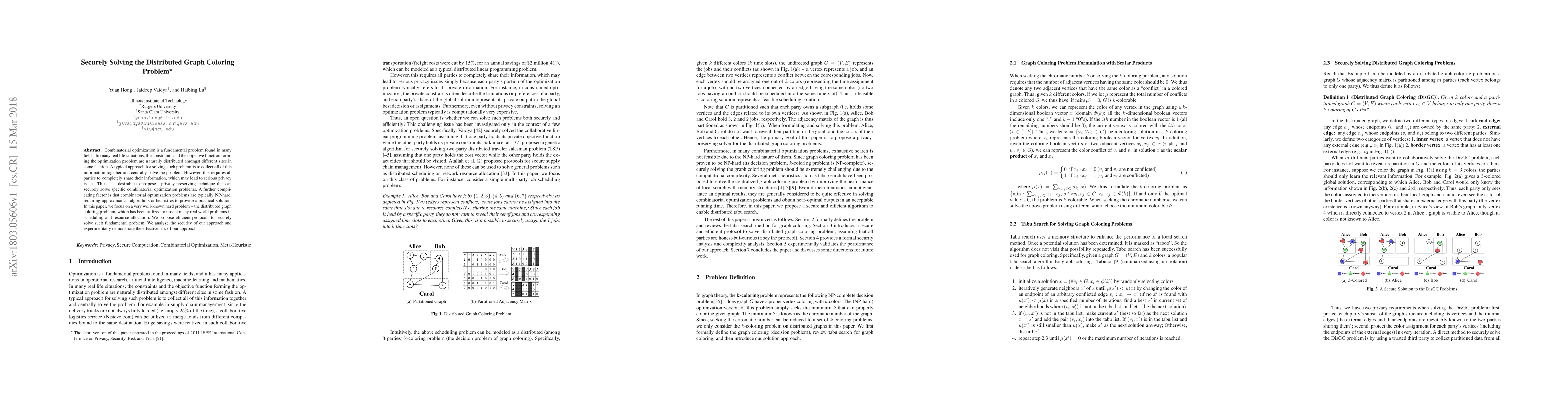 Combinatorial optimization is a fundamental problem found in many fields. In many real life situations, the constraints and the objective function forming the optimization problem are naturally distributed amongst different sites in some fashion. A typical approach for solving such problem is to collect all of this information together and centrally solve the problem. However, this requires all parties to completely share their information, which may lead to serious privacy issues. Thus, it is desirable to propose a privacy preserving technique that can securely solve specific combinatorial optimization problems. A further complicating factor is that combinatorial optimization problems are typically NP-hard, requiring approximation algorithms or heuristics to provide a practical solution. In this paper, we focus on a very well-known hard problem -- the distributed graph coloring problem, which has been utilized to model many real world problems in scheduling and resource allocation. We propose efficient protocols to securely solve such fundamental problem. We analyze the security of our approach and experimentally demonstrate the effectiveness of our approach.