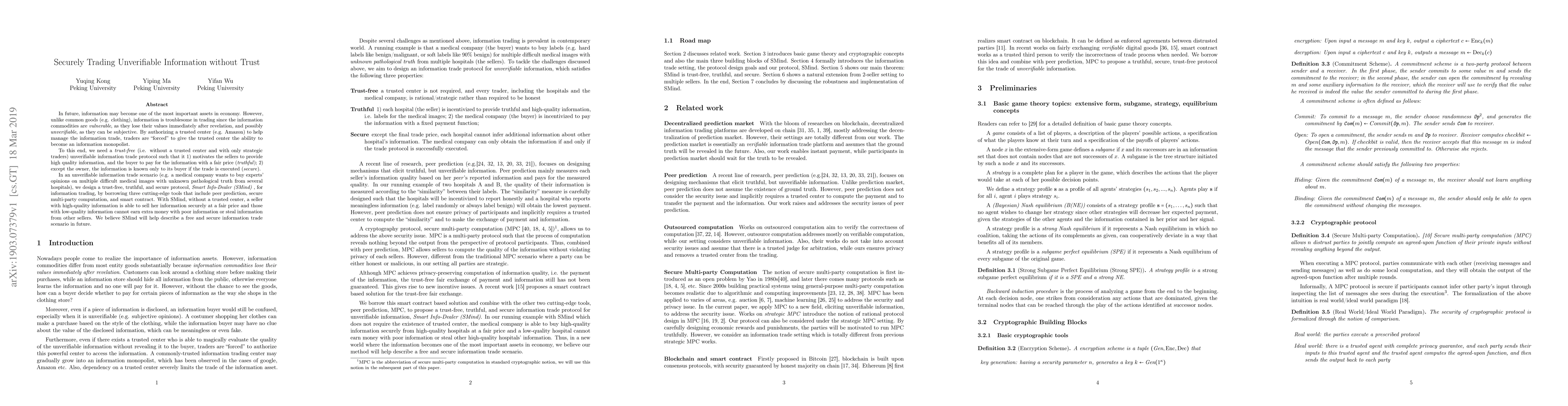 In future, information may become one of the most important assets in economy. However, unlike common goods (e.g. clothing), information is troublesome in trading since the information commodities are \emph{vulnerable}, as they lose their values immediately after revelation, and possibly unverifiable, as they can be subjective. By authorizing a trusted center (e.g. Amazon) to help manage the information trade, traders are ``forced'' to give the trusted center the ability to become an information monopolist. To this end, we need a trust-free (i.e. without a trusted center and with only strategic traders) unverifiable information trade protocol such that it 1) motivates the sellers to provide high quality information, and the buyer to pay for the information with a fair price (truthful); 2) except the owner, the information is known only to its buyer if the trade is executed (secure). In an unverifiable information trade scenario (e.g. a medical company wants to buy experts' opinions on multiple difficult medical images with unknown pathological truth from several hospitals), we design a trust-free, truthful, and secure protocol, Smart Info-Dealer (SMind), for information trading, by borrowing three cutting-edge tools that include peer prediction, secure multi-party computation, and smart contract. With SMind, without a trusted center, a seller with high-quality information is able to sell her information securely at a fair price and those with low-quality information cannot earn extra money with poor information or steal information from other sellers. We believe SMind will help describe a free and secure information trade scenario in the future.