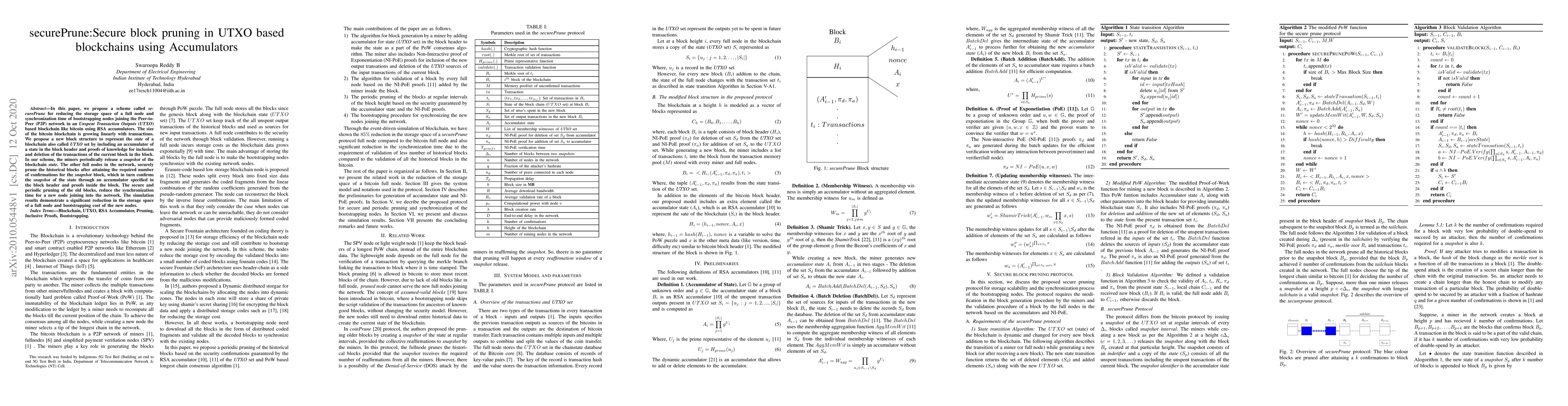 In this paper, we propose a scheme called securePrune for reducing the storage space of a full node and synchronization time of bootstrapping nodes joining the Peer-to-Peer (P2P) network in an Unspent Transaction Outputs (UTXO) based blockchain like bitcoin using RSA accumulators. The size of the bitcoin blockchain is growing linearly with transactions. We propose a new block structure to represent the state of a blockchain also called UTXO set by including an accumulator of a state in the block header and proofs of knowledge for inclusion and deletion of the transactions of the current block in the block. In our scheme, the miners periodically release a snapshot of the blockchain state. The other full nodes in the network, securely prune the historical blocks after attaining the required number of confirmations for the snapshot block, which in turn confirms the snapshot of the state through an accumulator specified in the block header and proofs inside the block. The secure and periodic pruning of the old blocks, reduce the synchronization time for a new node joining into the network. The simulation results demonstrate a significant reduction in the storage space of a full node and bootstrapping cost of the new nodes.