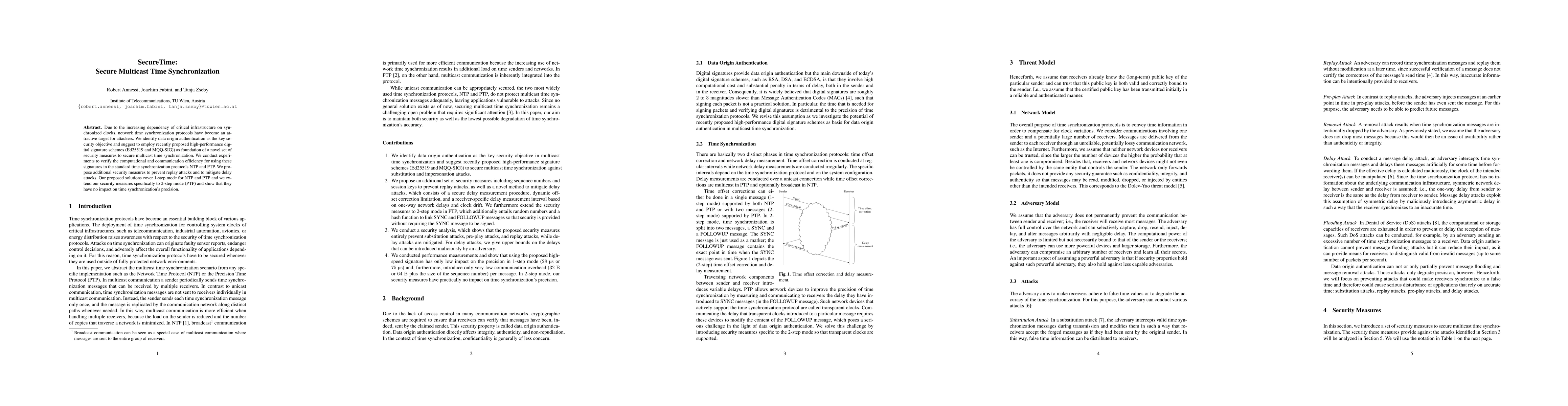 Due to the increasing dependency of critical infrastructure on synchronized clocks, network time synchronization protocols have become an attractive target for attackers. We identify data origin authentication as the key security objective and suggest to employ recently proposed high-performance digital signature schemes (Ed25519 and MQQ-SIG)) as foundation of a novel set of security measures to secure multicast time synchronization. We conduct experiments to verify the computational and communication efficiency for using these signatures in the standard time synchronization protocols NTP and PTP. We propose additional security measures to prevent replay attacks and to mitigate delay attacks. Our proposed solutions cover 1-step mode for NTP and PTP and we extend our security measures specifically to 2-step mode (PTP) and show that they have no impact on time synchronization's precision.