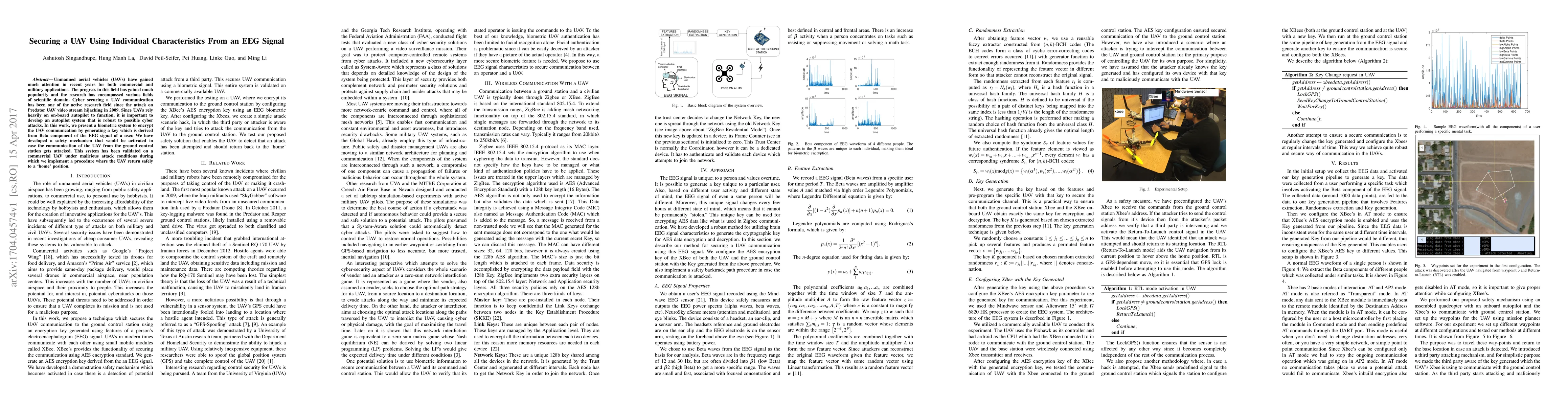 Unmanned aerial vehicles (UAVs) have gained much attention in recent years for both commercial and military applications. The progress in this field has gained much popularity and the research has encompassed various fields of scientific domain. Cyber securing a UAV communication has been one of the active research field since the attack on Predator UAV video stream hijacking in 2009. Since UAVs rely heavily on on-board autopilot to function, it is important to develop an autopilot system that is robust to possible cyber attacks. In this work, we present a biometric system to encrypt the UAV communication by generating a key which is derived from Beta component of the EEG signal of a user. We have developed a safety mechanism that would be activated in case the communication of the UAV from the ground control station gets attacked. This system has been validated on a commercial UAV under malicious attack conditions during which we implement a procedure where the UAV return safely to a "home" position.