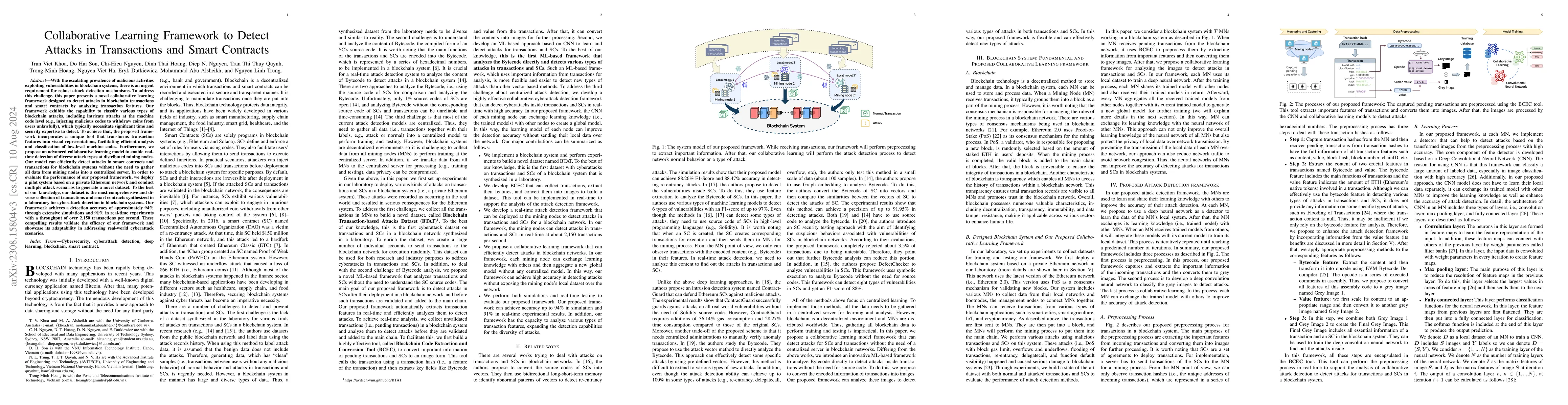 This paper introduces a collaborative learning framework to detect attacks in blockchain transactions and smart contracts, leveraging visual representations of transaction features and a customized model for real-time detection. The framework achieves approximately 94% accuracy in attack classification and demonstrates scalability with over 2,150 transactions per second.