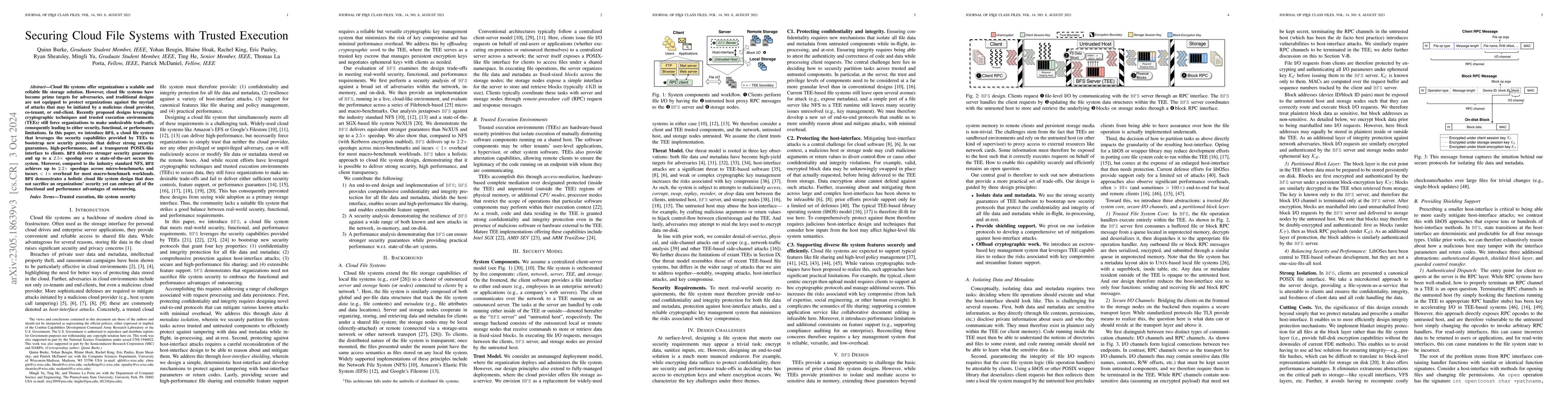 This paper introduces TFS, a secure cloud file system leveraging trusted execution environments to enhance security without compromising functionality or performance, achieving up to 2.1X speedups over NFS while maintaining <1X overhead.