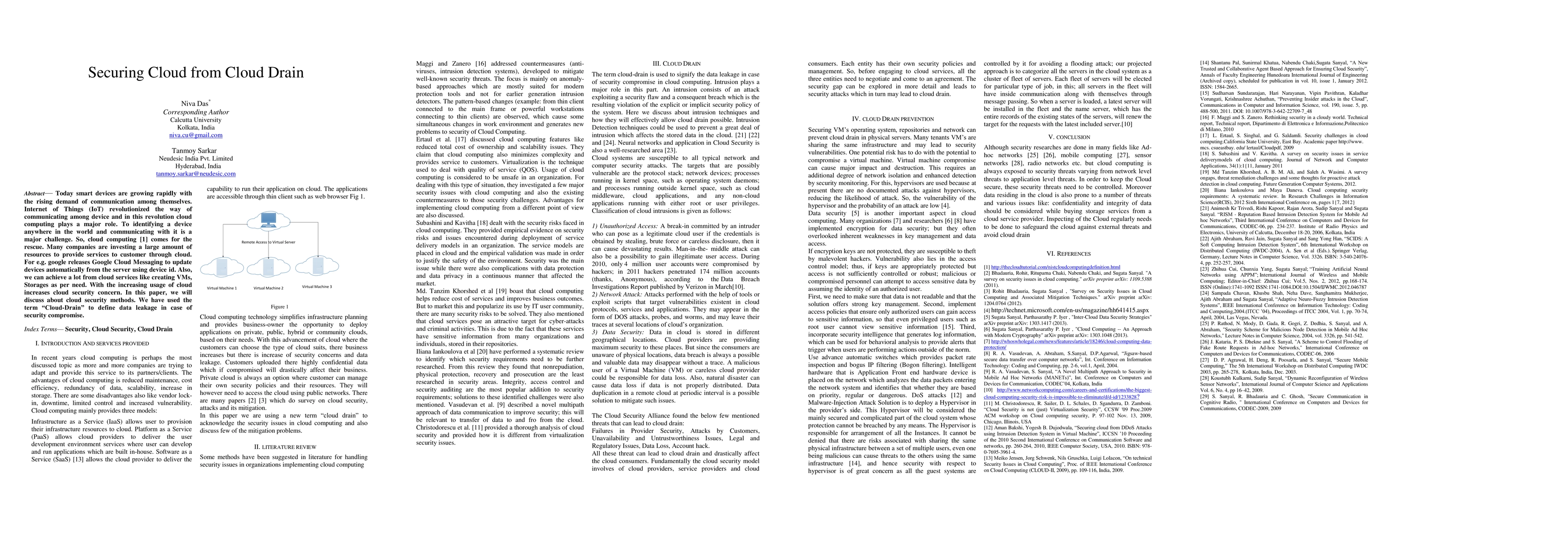 Today, in the world of communication, connected systems is growing at a rapid pace. To accommodate this growth the need for computational power and storage is also increasing at a similar rate. Companies are investing a large amount of resources in buying, maintaining and ensuring availability of the system to their customers. To mitigate these issues, cloud computing is playing a major role.The underlying concept of cloud computing dates back to the 50's but the term entering into widespread usage can be traced to 2006 when Amazon.com announced the Elastic Compute Cloud.In this paper, we will discuss about cloud security approaches. We have used the term Cloud-Drain to define data leakage in case of security compromise.