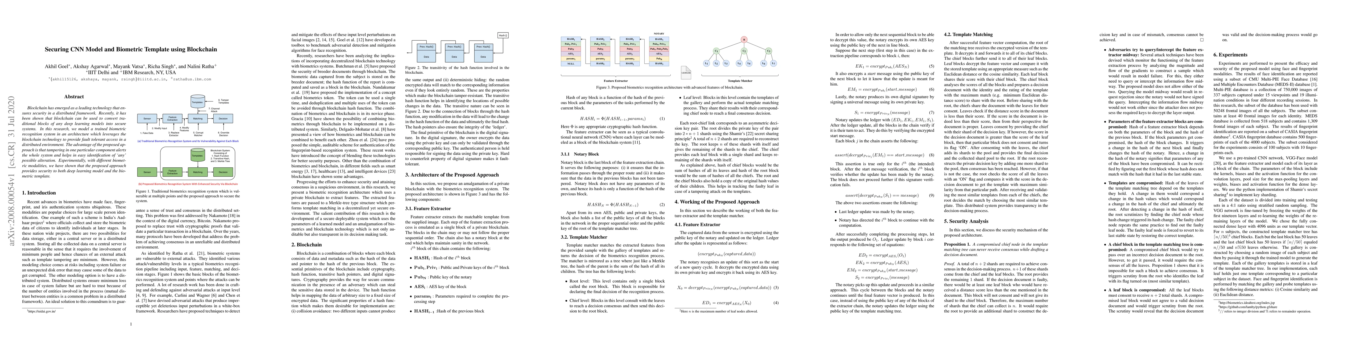 Blockchain has emerged as a leading technology that ensures security in a distributed framework. Recently, it has been shown that blockchain can be used to convert traditional blocks of any deep learning models into secure systems. In this research, we model a trained biometric recognition system in an architecture which leverages the blockchain technology to provide fault tolerant access in a distributed environment. The advantage of the proposed approach is that tampering in one particular component alerts the whole system and helps in easy identification of `any' possible alteration. Experimentally, with different biometric modalities, we have shown that the proposed approach provides security to both deep learning model and the biometric template.