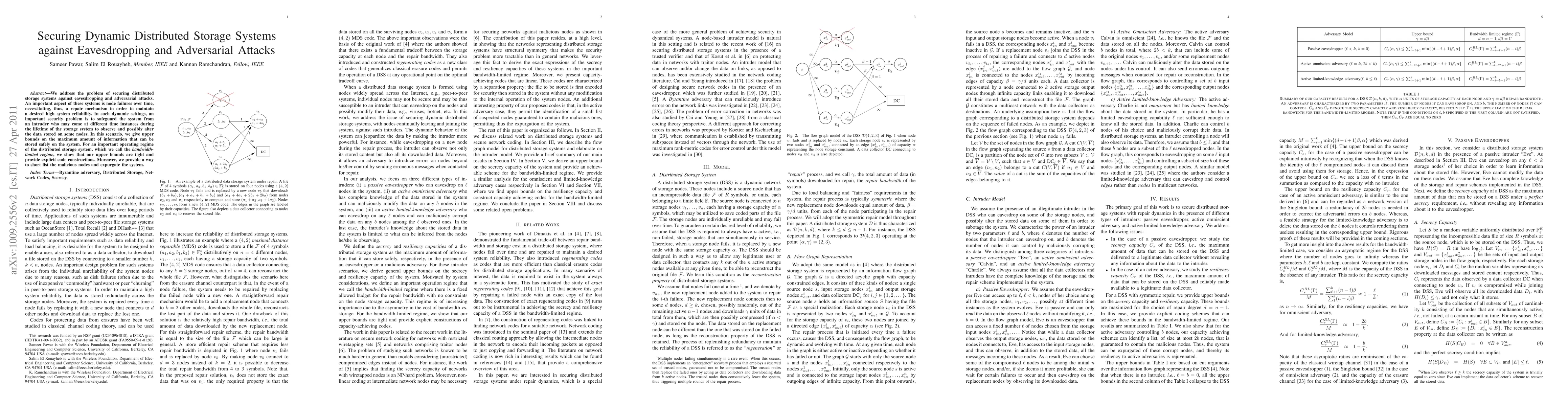 This paper develops security measures for dynamic distributed storage systems to protect against eavesdropping and adversarial attacks, especially in the presence of node failures. It provides tight upper bounds and code constructions for secure data storage in the 'bandwidth-limited regime' and outlines methods for identifying and removing malicious nodes.