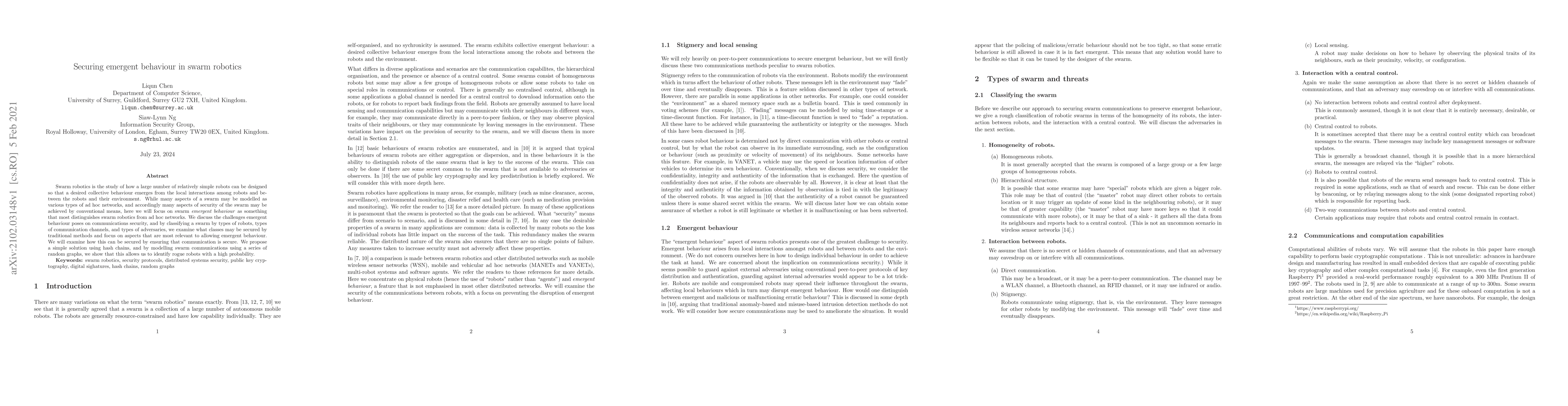 Swarm robotics is the study of how a large number of relatively simple robots can be designed so that a desired collective behaviour emerges from the local interactions among robots and between the robots and their environment. While many aspects of a swarm may be modelled as various types of ad hoc networks, and accordingly many aspects of security of the swarm may be achieved by conventional means, here we will focus on swarm emergent behaviour as something that most distinguishes swarm robotics from ad hoc networks. We discuss the challenges emergent behaviour poses on communications security, and by classifying a swarm by types of robots, types of communication channels, and types of adversaries, we examine what classes may be secured by traditional methods and focus on aspects that are most relevant to allowing emergent behaviour. We will examine how this can be secured by ensuring that communication is secure. We propose a simple solution using hash chains, and by modelling swarm communications using a series of random graphs, we show that this allows us to identify rogue robots with a high probability.