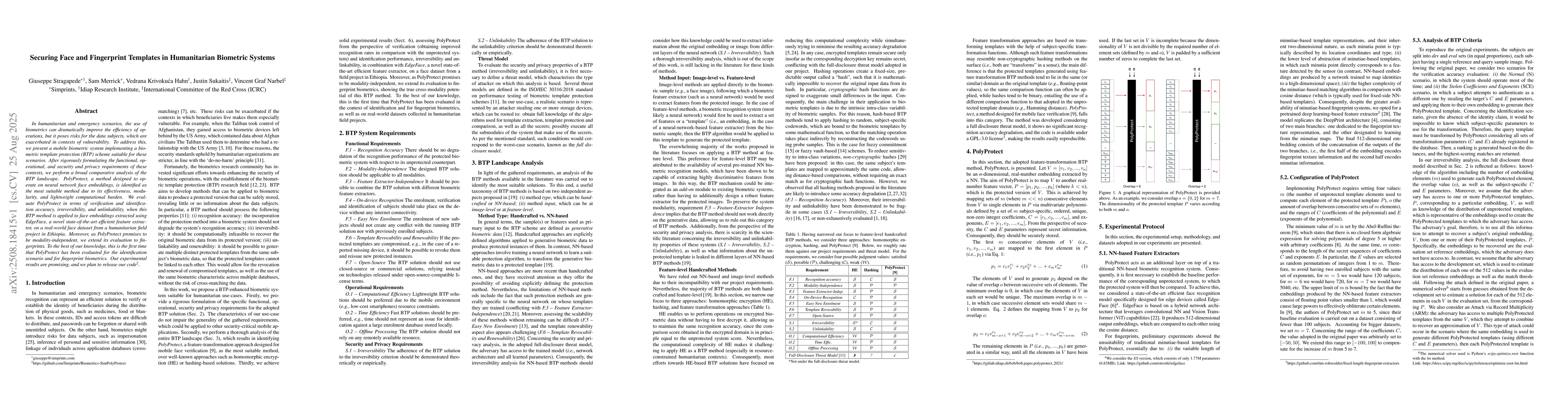 In humanitarian and emergency scenarios, the use of biometrics can dramatically improve the efficiency of operations, but it poses risks for the data subjects, which are exacerbated in contexts of vulnerability. To address this, we present a mobile biometric system implementing a biometric template protection (BTP) scheme suitable for these scenarios. After rigorously formulating the functional, operational, and security and privacy requirements of these contexts, we perform a broad comparative analysis of the BTP landscape. PolyProtect, a method designed to operate on neural network face embeddings, is identified as the most suitable method due to its effectiveness, modularity, and lightweight computational burden. We evaluate PolyProtect in terms of verification and identification accuracy, irreversibility, and unlinkability, when this BTP method is applied to face embeddings extracted using EdgeFace, a novel state-of-the-art efficient feature extractor, on a real-world face dataset from a humanitarian field project in Ethiopia. Moreover, as PolyProtect promises to be modality-independent, we extend its evaluation to fingerprints. To the best of our knowledge, this is the first time that PolyProtect has been evaluated for the identification scenario and for fingerprint biometrics. Our experimental results are promising, and we plan to release our code