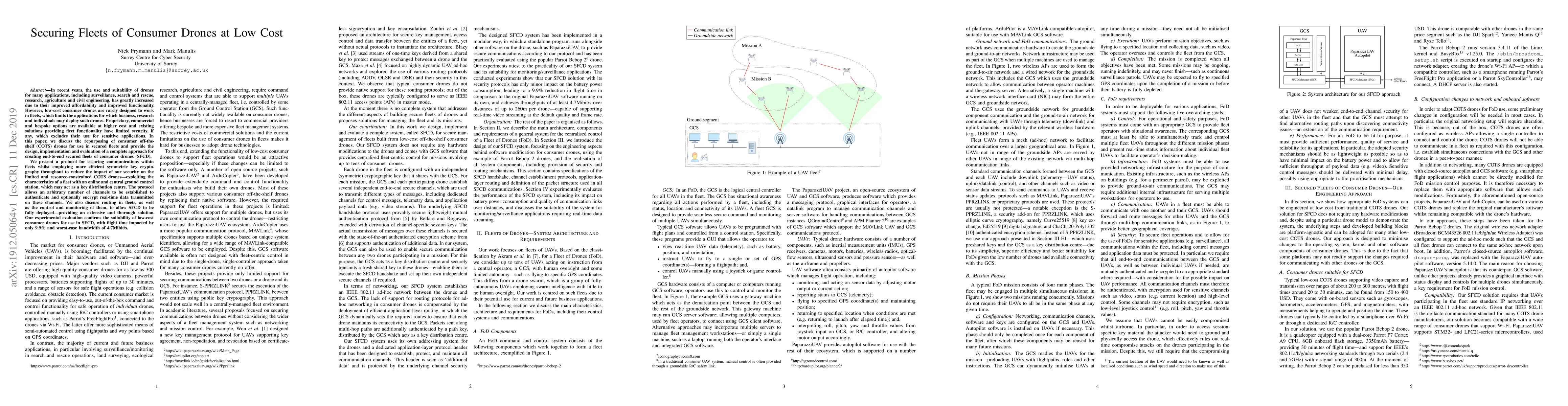 In recent years, the use and suitability of drones for many applications, including surveillance, search and rescue, research, agriculture and civil engineering, has greatly increased due to their improved affordability and improved functionality. However, low-cost consumer drones are rarely designed to work in fleets, which limits the applications for which business, research and individuals may deploy such drones. Proprietary, commercial and bespoke options are available at higher cost and existing solutions providing fleet functionality have limited security, if any, which excludes their use for sensitive applications. In this paper, we discuss the repurposing of consumer off-the-shelf (COTS) drones for use in secured fleets and provide the design, implementation and evaluation of a complete approach for creating end-to-end secured fleets of consumer drones (SFCD). We present a protocol for securing communications within fleets whilst employing more efficient symmetric key cryptography throughout to reduce the impact of our security on the limited and resource-constrained COTS drones, exploiting the characteristics of a fleet with an online and central ground control station, which may act as a key distribution centre. The protocol allows an arbitrary number of channels to be established to authenticate and optionally encrypt real-time data transmitted on these channels. We also discuss routing in fleets, as well as the control and monitoring of them, to allow SFCD to be fully deployed; providing an extensive and thorough solution. Our experimental evaluation confirms the suitability of low-cost consumer drones for use in SFCD, with flight time impacted by only 9.9% and worst-case bandwidth of 4.7Mibit/s.