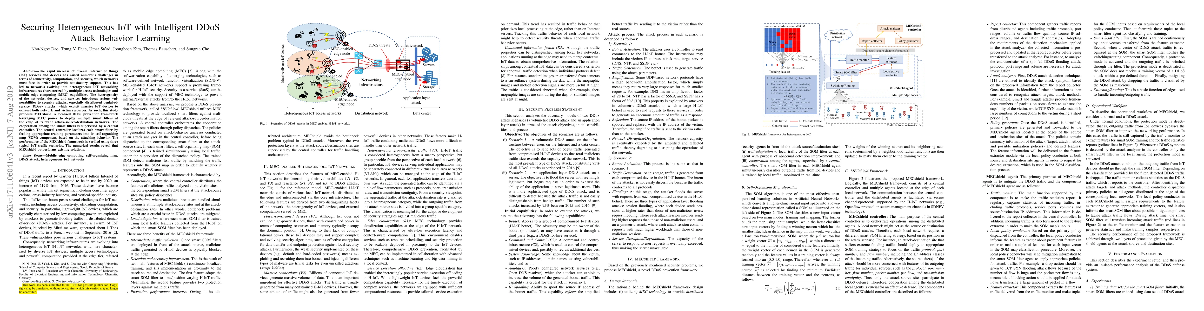 The rapid increase of diverse Internet of things (IoT) services and devices has raised numerous challenges in terms of connectivity, computation, and security, which networks must face in order to provide satisfactory support. This has led to networks evolving into heterogeneous IoT networking infrastructures characterized by multiple access technologies and mobile edge computing (MEC) capabilities. The heterogeneity of the networks, devices, and services introduces serious vulnerabilities to security attacks, especially distributed denial-of-service (DDoS) attacks, which exploit massive IoT devices to exhaust both network and victim resources. As such, this study proposes MECshield, a localized DDoS prevention framework leveraging MEC power to deploy multiple smart filters at the edge of relevant attack-source/destination networks. The cooperation among the smart filters is supervised by a central controller. The central controller localizes each smart filter by feeding appropriate training parameters into its self-organizing map (SOM) component, based on the attacking behavior. The performance of the MECshield framework is verified using three typical IoT traffic scenarios. The numerical results reveal that MECshield outperforms existing solutions.