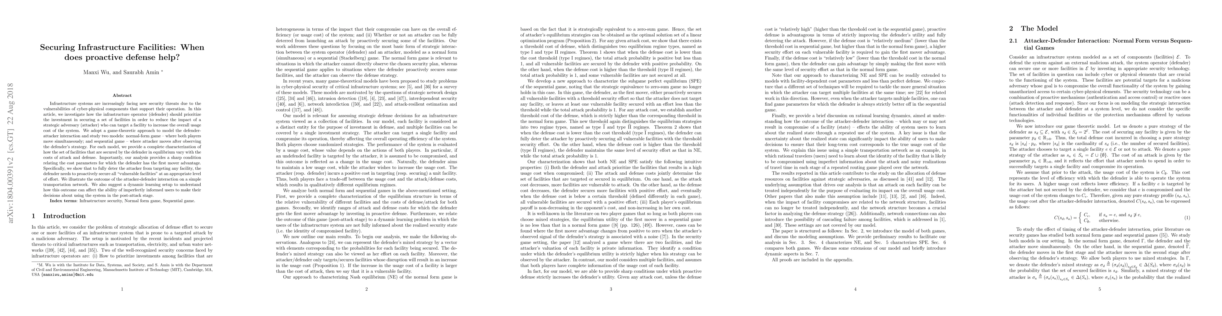 This paper uses game theory to analyze how infrastructure operators should prioritize investments to secure facilities against strategic adversaries. It finds that proactive defense is crucial when the cost of securing vulnerable facilities is appropriately balanced against the cost of attacks, ensuring the defender can deter adversaries from targeting any facility.