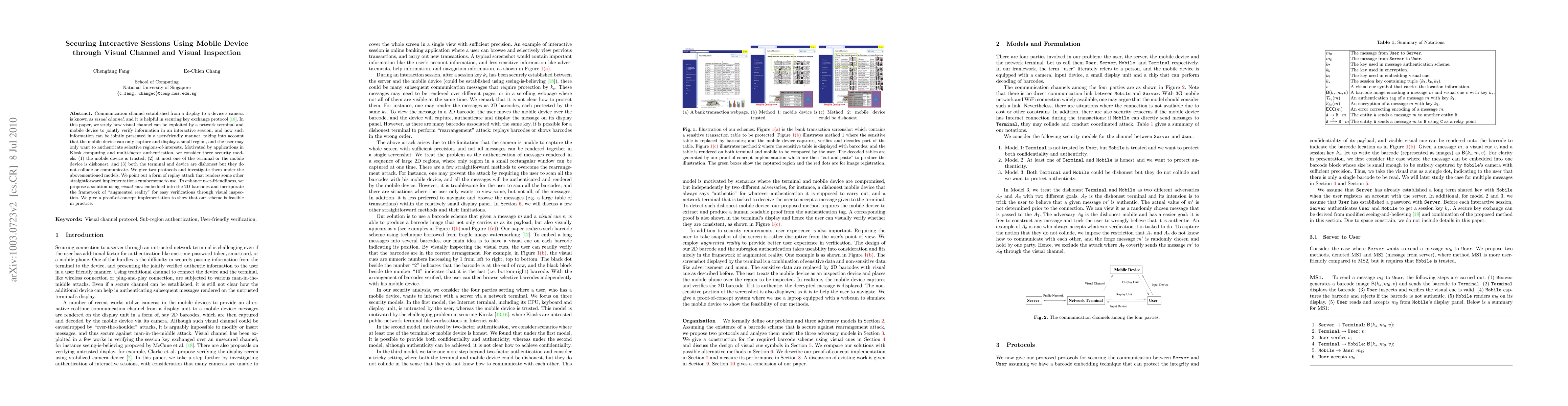 This paper explores securing interactive sessions by leveraging the visual channel between a display and a mobile device's camera, proposing two protocols for key exchange and verification. It addresses challenges in user-friendly authentication, especially for selective regions of interest, and introduces visual cues in 2D barcodes and augmented reality for enhanced verification.