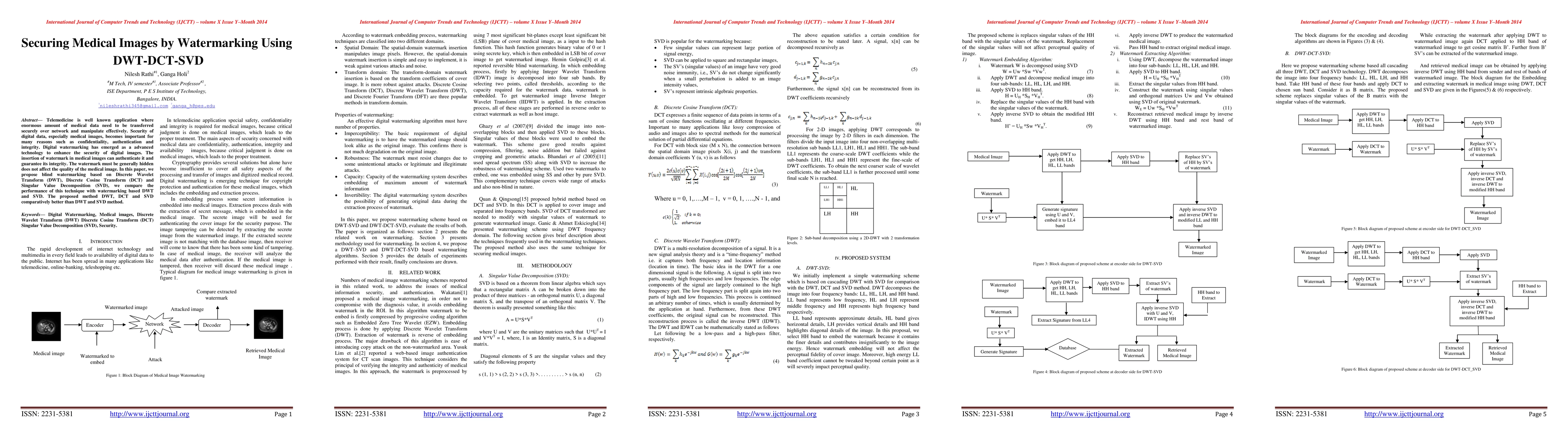 Telemedicine is well known application where enormous amount of medical data need to be transferred securely over network and manipulate effectively. Security of digital data, especially medical images, becomes important for many reasons such as confidentiality, authentication and integrity. Digital watermarking has emerged as a advanced technology to enhance the security of digital images. The insertion of watermark in medical images can authenticate it and guarantee its integrity. The watermark must be generally hidden does not affect the quality of the medical image. In this paper, we propose blind watermarking based on Discrete Wavelet Transform (DWT), Discrete Cosine Transform (DCT) and Singular Value Decomposition (SVD), we compare the performance of this technique with watermarking based DWT and SVD. The proposed method DWT, DCT and SVD comparatively better than DWT and SVD method.