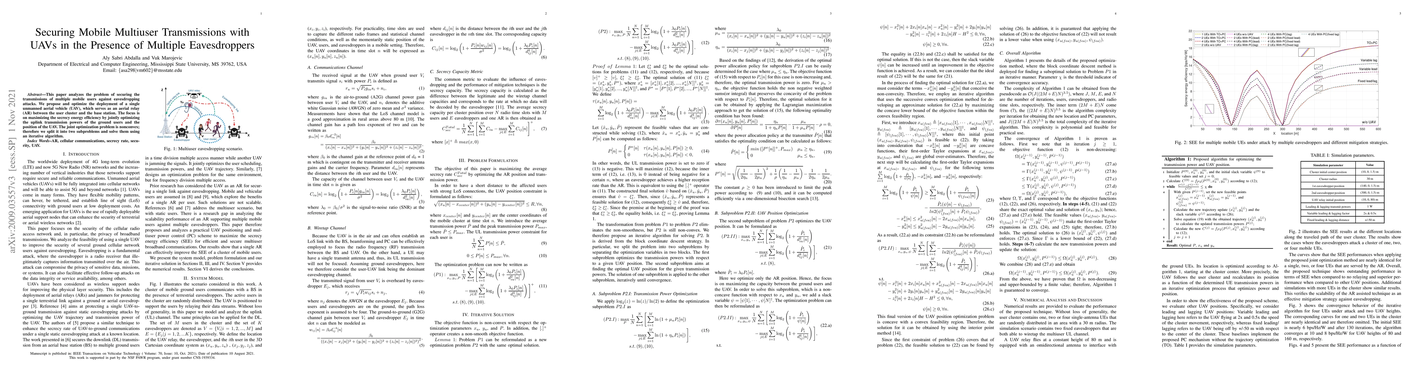 This paper proposes a UAV-based system to secure mobile multiuser transmissions against eavesdropping attacks, optimizing transmission powers and UAV position for maximum secrecy energy efficiency.