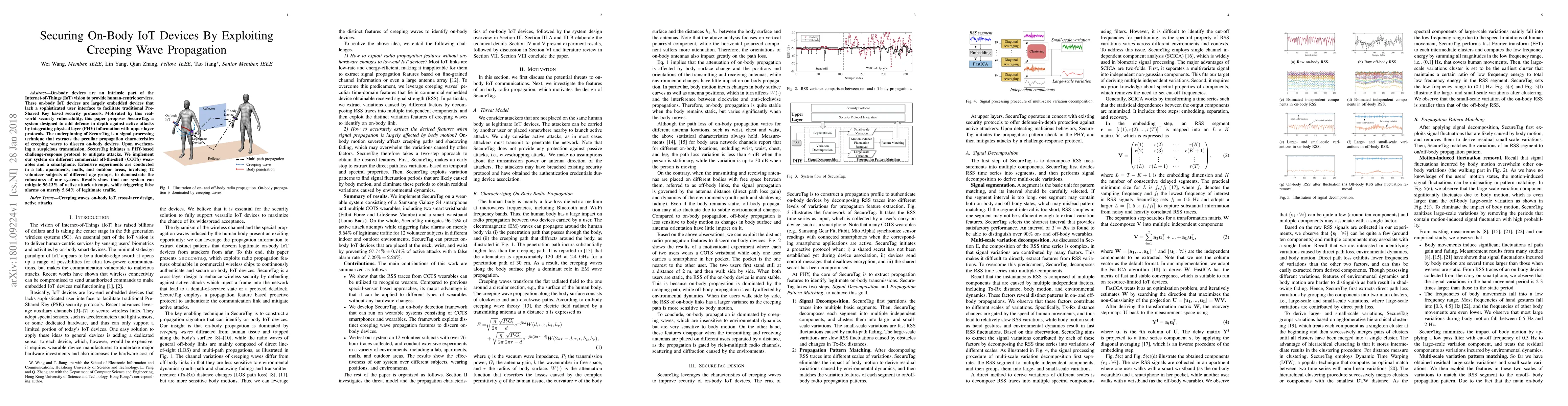 This paper introduces SecureTag, a system designed to enhance the security of on-body IoT devices by leveraging creeping wave propagation characteristics. The system employs a PHY-based challenge-response protocol to detect and mitigate active attacks, demonstrating robust performance across various environments and volunteer subjects.
