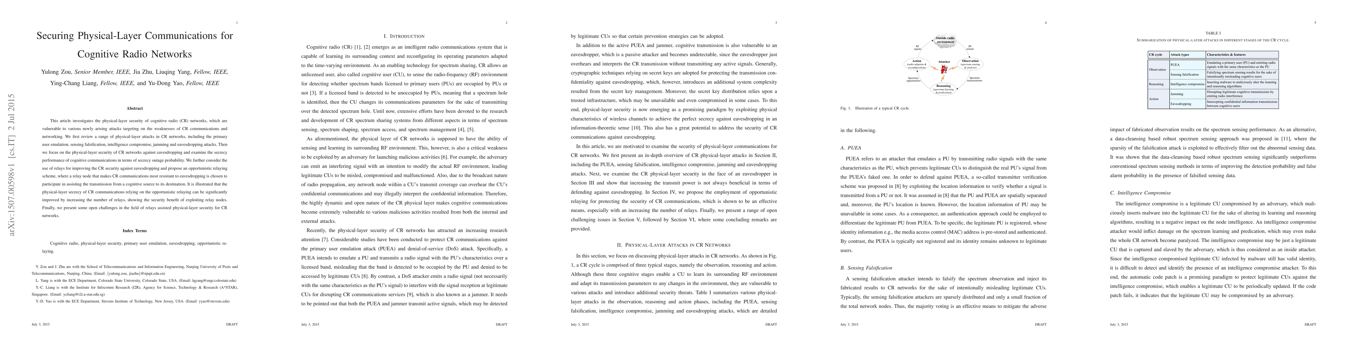 This paper reviews physical-layer attacks in cognitive radio networks and proposes an opportunistic relaying scheme to enhance security against eavesdropping, demonstrating improved secrecy performance with more relay nodes. It also highlights open challenges in relay-assisted physical-layer security for cognitive radio networks.