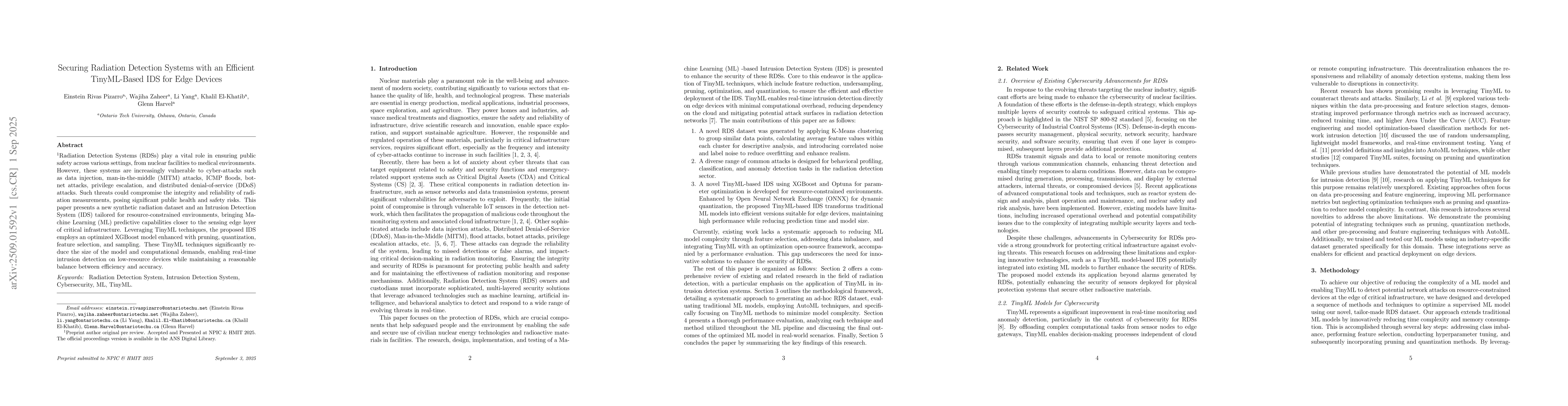 Radiation Detection Systems (RDSs) play a vital role in ensuring public safety across various settings, from nuclear facilities to medical environments. However, these systems are increasingly vulnerable to cyber-attacks such as data injection, man-in-the-middle (MITM) attacks, ICMP floods, botnet attacks, privilege escalation, and distributed denial-of-service (DDoS) attacks. Such threats could compromise the integrity and reliability of radiation measurements, posing significant public health and safety risks. This paper presents a new synthetic radiation dataset and an Intrusion Detection System (IDS) tailored for resource-constrained environments, bringing Machine Learning (ML) predictive capabilities closer to the sensing edge layer of critical infrastructure. Leveraging TinyML techniques, the proposed IDS employs an optimized XGBoost model enhanced with pruning, quantization, feature selection, and sampling. These TinyML techniques significantly reduce the size of the model and computational demands, enabling real-time intrusion detection on low-resource devices while maintaining a reasonable balance between efficiency and accuracy.