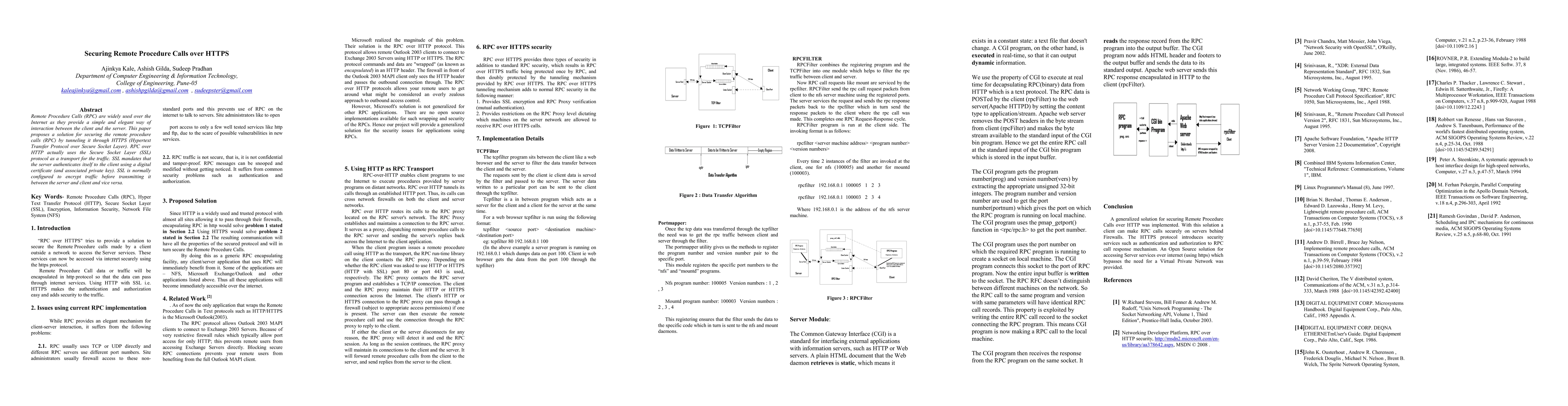 This paper proposes securing Remote Procedure Calls (RPC) by tunneling them through HTTPS, leveraging SSL for encryption and server authentication via digital certificates to ensure secure client-server interactions over the Internet.