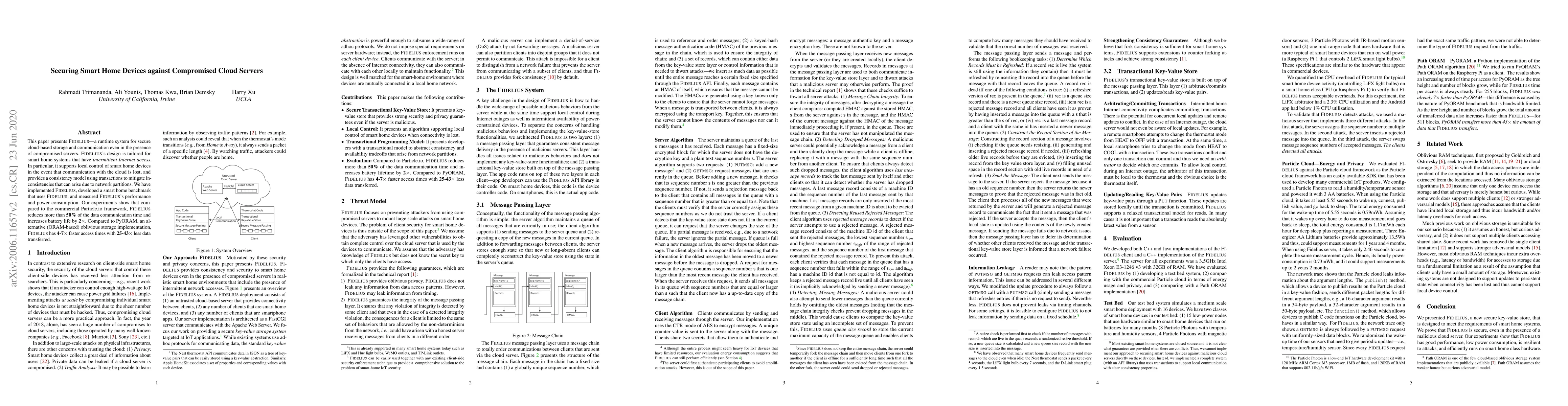 FIDELIUS introduces a secure transactional key-value store, local control algorithms for smart home devices during internet outages, and a transactional programming model to abstract consistency and availability trade-offs from network partitions.