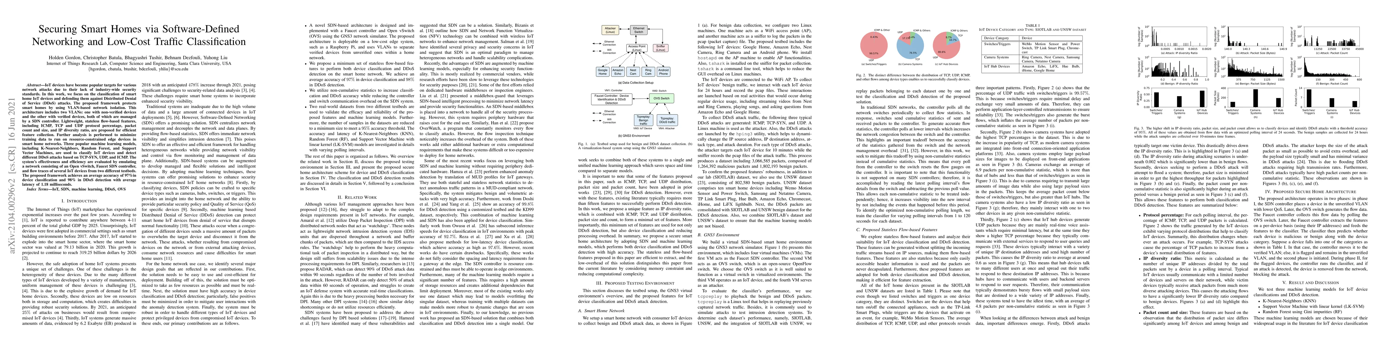 IoT devices have become popular targets for various network attacks due to their lack of industry-wide security standards. In this work, we focus on smart home IoT device identification and defending them against Distributed Denial of Service (DDoS) attacks. The proposed framework protects smart homes by using VLAN-based network isolation. This architecture has two VLANs: one with non-verified devices and the other with verified devices, both of which are managed by the SDN controller. Lightweight stateless flow-based features, including ICMP, TCP, and UDP protocol percentage, packet count and size, and IP diversity ratio, are proposed for efficient feature collections. Further analysis is performed to minimize training data to run on resource-constrained edge devices in smart home networks. Three popular machine learning algorithms, including K-Nearest-Neighbors, Random Forest, and Support Vector Machines, are used to classify IoT devices and detect different types of DDoS attacks, including TCP-SYN, UDP, and ICMP. The system's effectiveness and efficiency are evaluated by emulating a network consisting of an Open vSwitch, Faucet SDN controller, and several IoT device traces from two different testbeds.