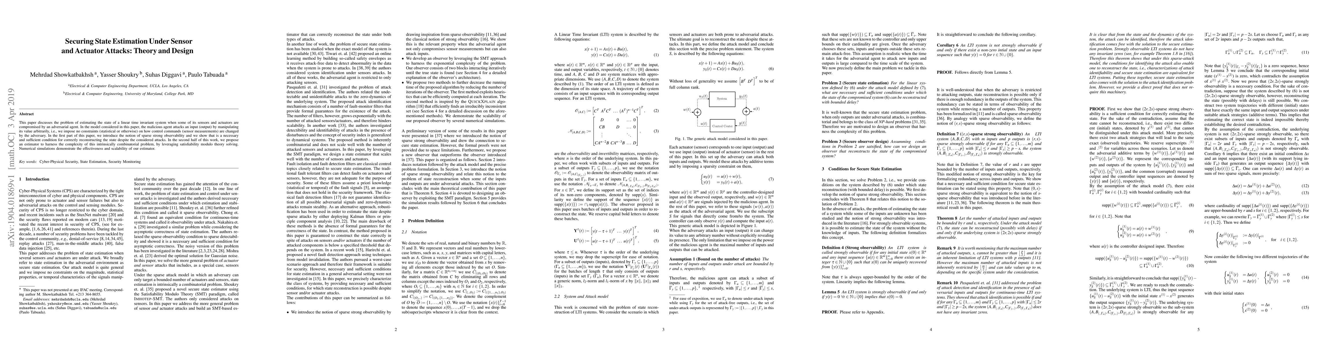 A research paper proposes a method to secure state estimation in linear systems when sensors and actuators are attacked by malicious agents. It introduces a condition for correct state reconstruction and offers an estimator that leverages satisfiability modulo theory solving to effectively handle the attacks.